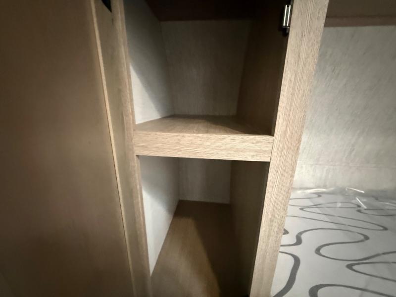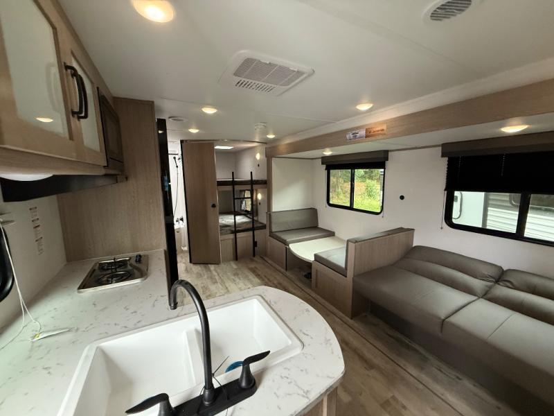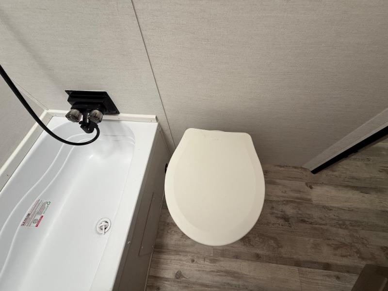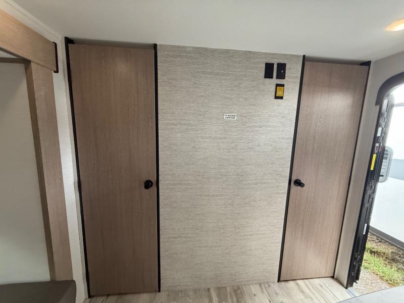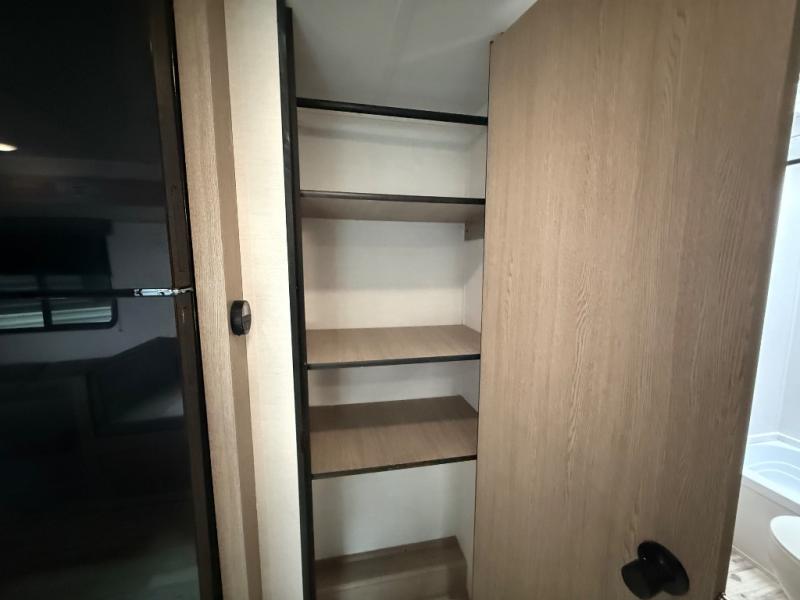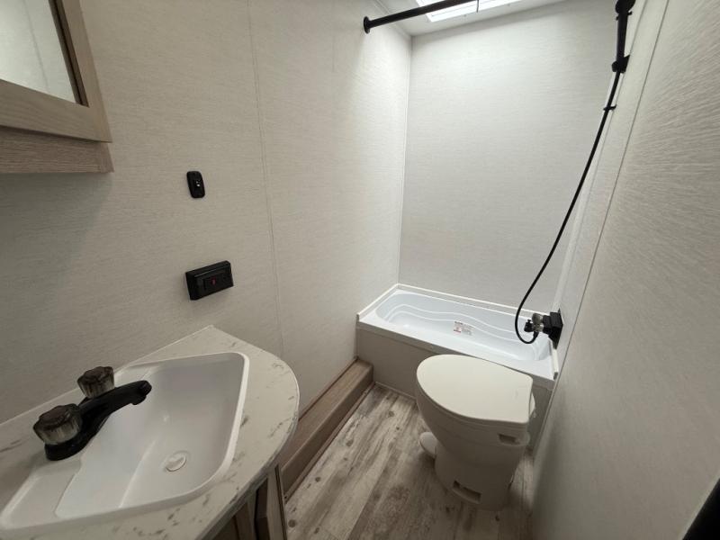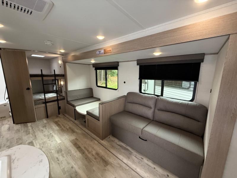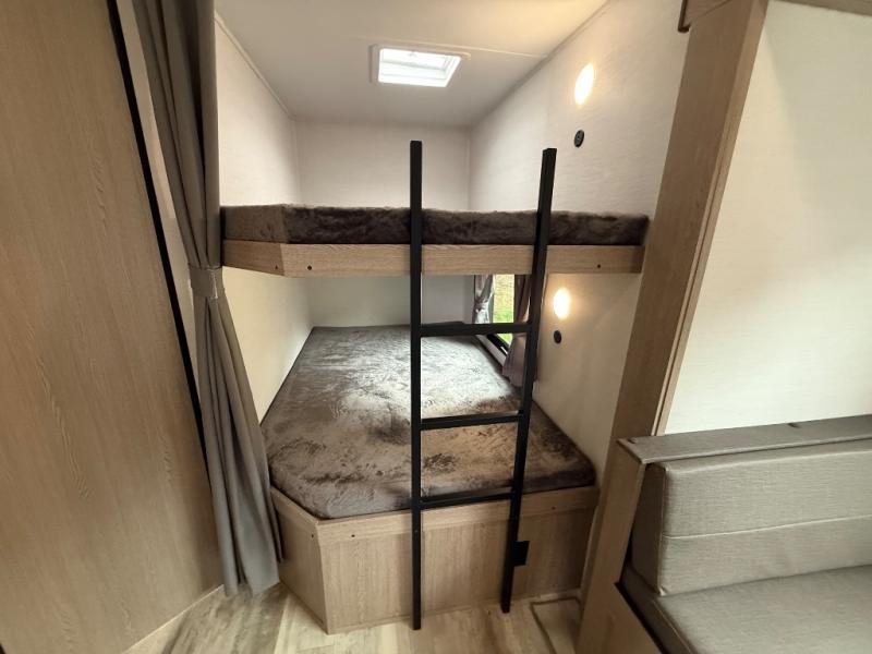 Invite more along with double-size bunks in this 'Show Stopper' travel trailer! The private shower and toilet is close to the bunks if you're camping with little ones making it quite convenient, especially at night. You will be comfortable on the front RV queen bed with dual bedside nightstands and shirt closets. The kitchen features everything you need to create meals and snacks for your entire family, and the outside pass-through storage allows you to easily tuck away your gear like fishing poles, camp chairs and games, plus more!