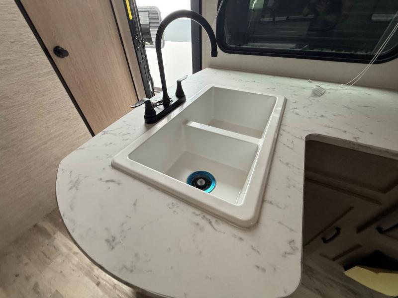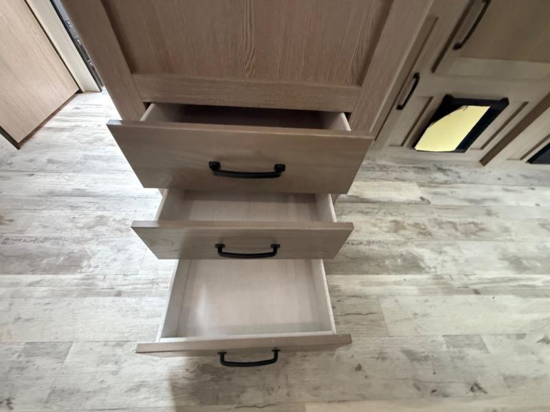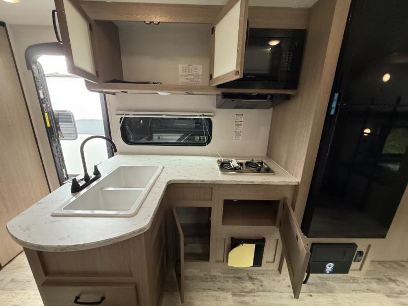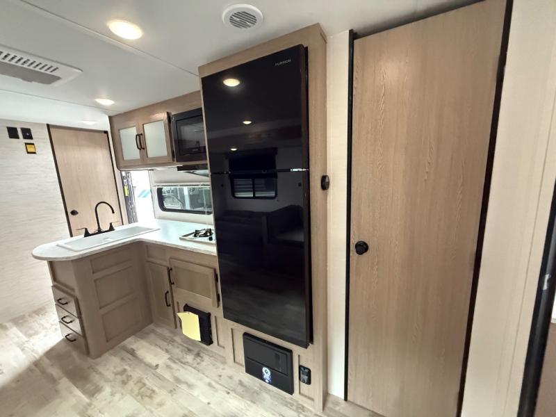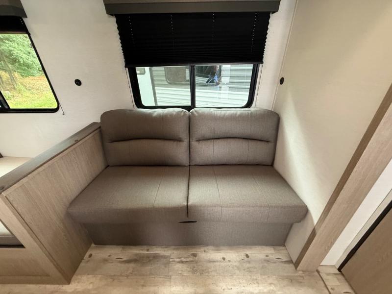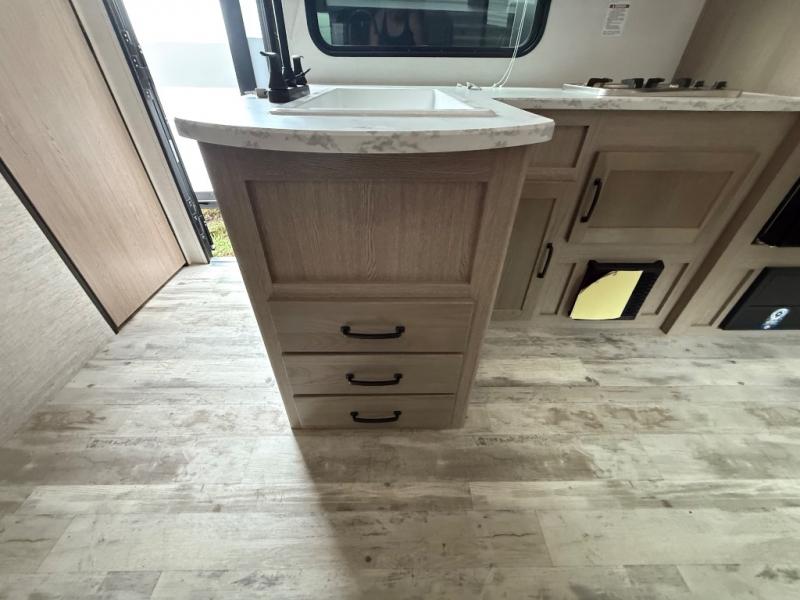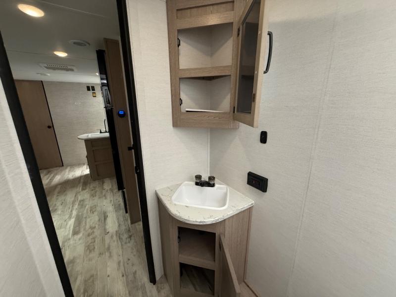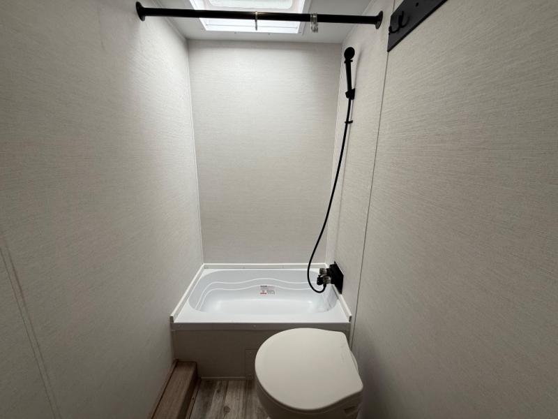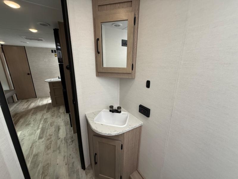 Invite more along with double-size bunks in this 'Show Stopper' travel trailer! The private shower and toilet is close to the bunks if you're camping with little ones making it quite convenient, especially at night. You will be comfortable on the front RV queen bed with dual bedside nightstands and shirt closets. The kitchen features everything you need to create meals and snacks for your entire family, and the outside pass-through storage allows you to easily tuck away your gear like fishing poles, camp chairs and games, plus more!