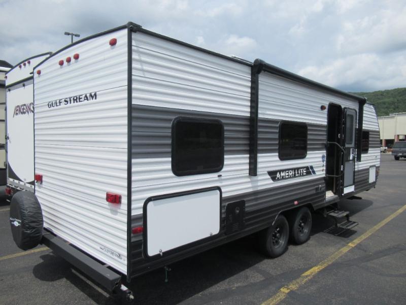 The Ameri-Lite Ultra Lite travel trailers by Gulf Stream are the perfect RV for families wanting to start their camping lifestyle, but not break the bank. These lightweight units are built with a diamond plate lower front, a one-piece synthetic vinyl roof, and a uni-body construction with steel hurricane straps tying the walls to the floor for added durability. The front power hitch jack and four stabilizer jacks will make set-up hassle-free once you arrive at the campground, and you can put out the electric awning to rest in the shade when you're done. Each model includes convenient amenities, like the 13,500 BTU A/C, the tankless water heater, a central control panel, and multiple USB ports for your tablet, phone, and camera! The inside is designed to make you feel at home with radiant LED lighting, designer kitchen backsplash, pleated privacy shades, craft-made cabinetry, plus many more features. Start your RV lifestyle with an affordable, lightweight Ameri-Lite Ultra Lite travel trailer today!