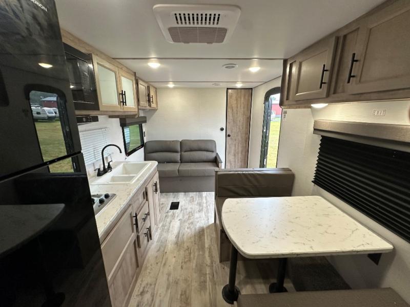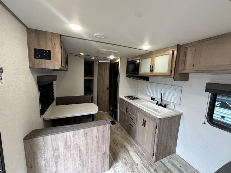 Make your reservations, start planning your menu, and load up your clothes, games, food and more for a fun weekend camping in this 'Show Stopper' trailer! You will have a front private bedroom with a queen-size bed and closets, while your family and friends can choose from the double-size bunks and furniture to sleep on. There is a convertible sofa and a booth dinette, plus a galley kitchen with a microwave oven, sink, plus overhead storage for pots, pans, and dry goods. The rear corner full bathroom offers a tub/shower, toilet, and a sink to be able to get cleaned up in after hiking or relaxing by a fire.