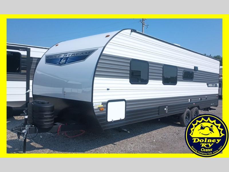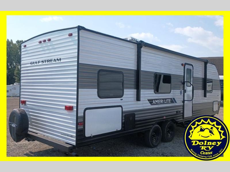The Ameri-Lite Ultra Lite travel trailers by Gulf Stream are the perfect RV for families wanting to start their camping lifestyle, but not break the bank. These lightweight units are built with a diamond plate lower front, a one-piece synthetic vinyl roof, and a uni-body construction with steel hurricane straps tying the walls to the floor for added durability. The front power hitch jack and four stabilizer jacks will make set-up hassle-free once you arrive at the campground, and you can put out the electric awning to rest in the shade when you're done. Each model includes convenient amenities, like the 13,500 BTU A/C, the tankless water heater, a central control panel, and multiple USB ports for your tablet, phone, and camera! The inside is designed to make you feel at home with radiant LED lighting, designer kitchen backsplash, pleated privacy shades, craft-made cabinetry, plus many more features. Start your RV lifestyle with an affordable, lightweight Ameri-Lite Ultra Lite travel trailer today!