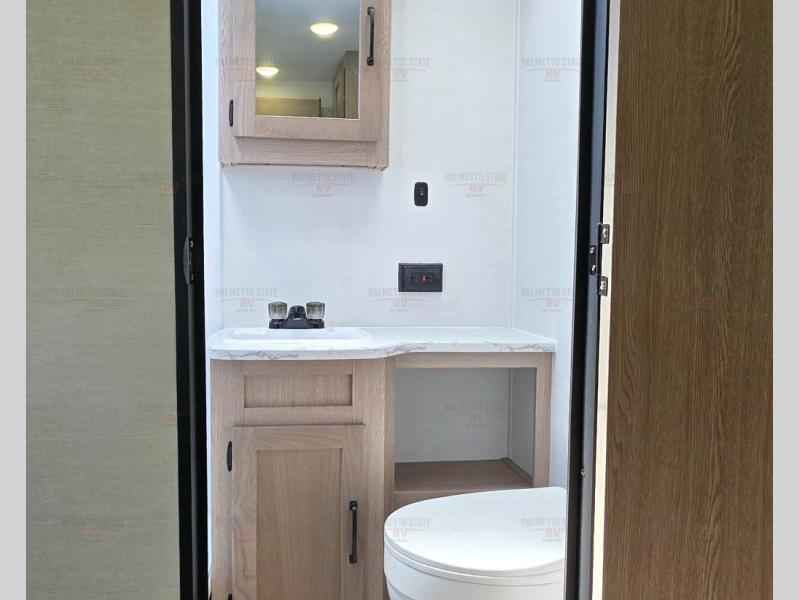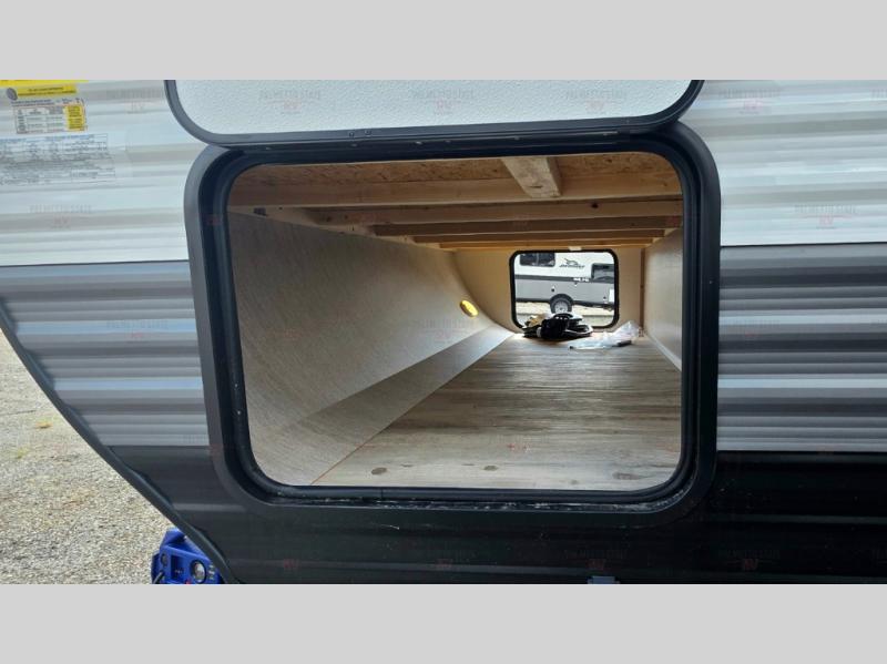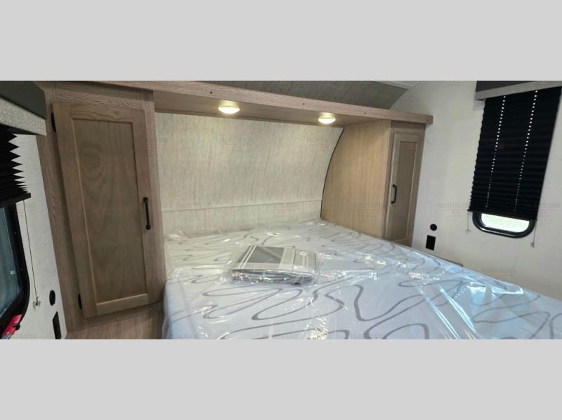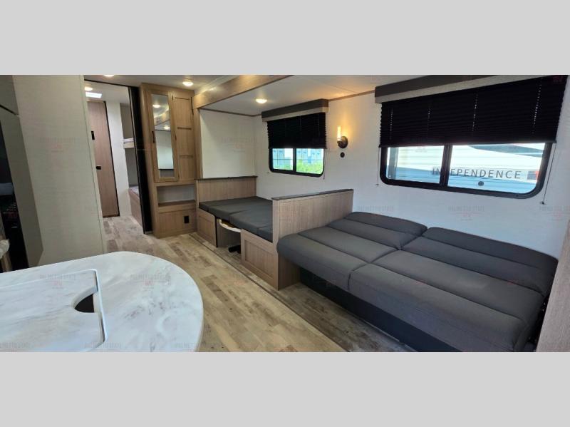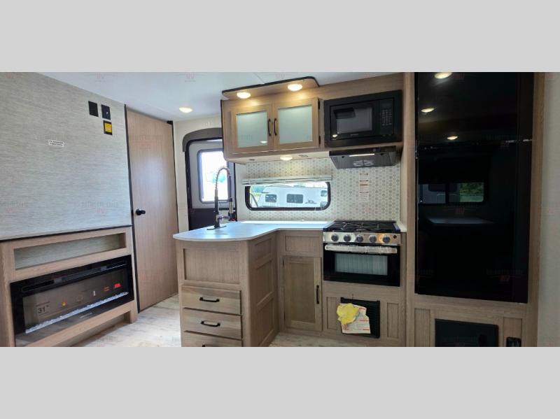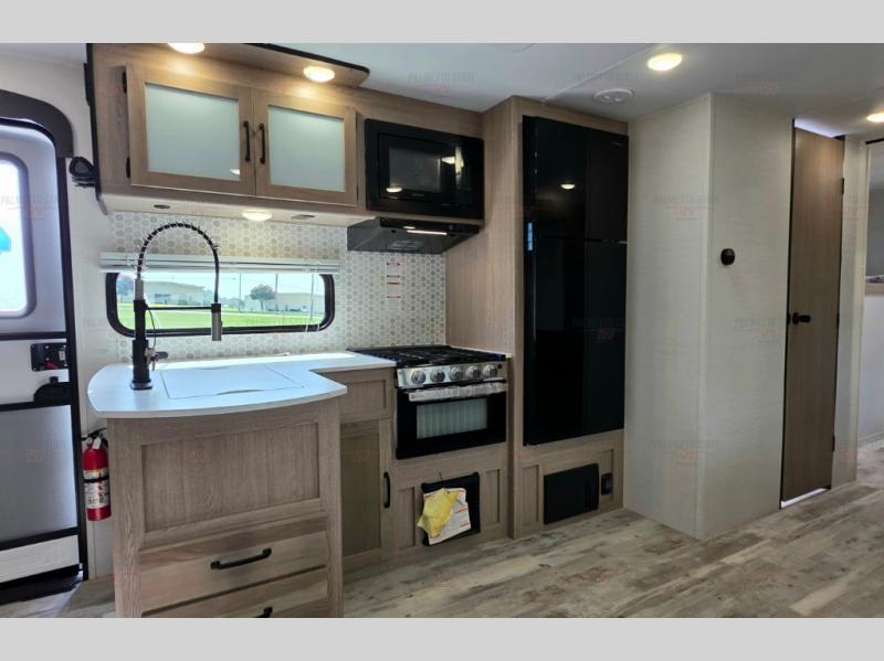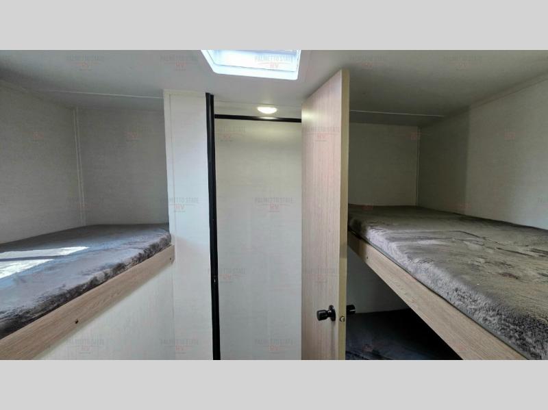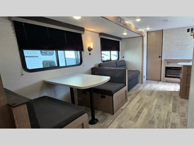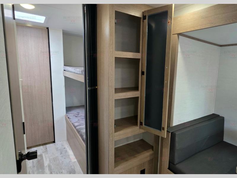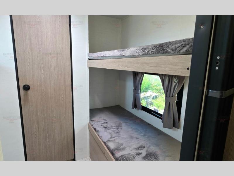 A private bunkhouse for your guests or the kids, and a private bedroom up front make this the perfect travel trailer for camping adventures. The large slide out includes the booth dinette and sofa, which will be great to dine at and relax, and the full bath is easily accessible for everyone. The kitchen includes everything you need to prepare meals each day, including a three burner cooktop and a 10.7 cu. ft. Everchill refrigerator/freezer for perishables. You can also choose to add the optional outside kitchen if you are one that loves to spend a lot of time outdoors!