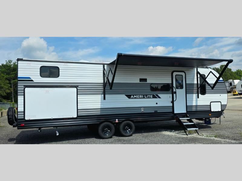 The Ameri-Lite Ultra Lite travel trailers by Gulf Stream are the perfect RV for families wanting to start their camping lifestyle, but not break the bank. These lightweight units are built with a diamond plate lower front, a one-piece synthetic vinyl roof, and a uni-body construction with steel hurricane straps tying the walls to the floor for added durability. The front power hitch jack and four stabilizer jacks will make set-up hassle-free once you arrive at the campground, and you can put out the electric awning to rest in the shade when you're done. Each model includes convenient amenities, like the 13,500 BTU A/C, the tankless water heater, a central control panel, and multiple USB ports for your tablet, phone, and camera! The inside is designed to make you feel at home with radiant LED lighting, designer kitchen backsplash, pleated privacy shades, craft-made cabinetry, plus many more features. Start your RV lifestyle with an affordable, lightweight Ameri-Lite Ultra Lite travel trailer today!