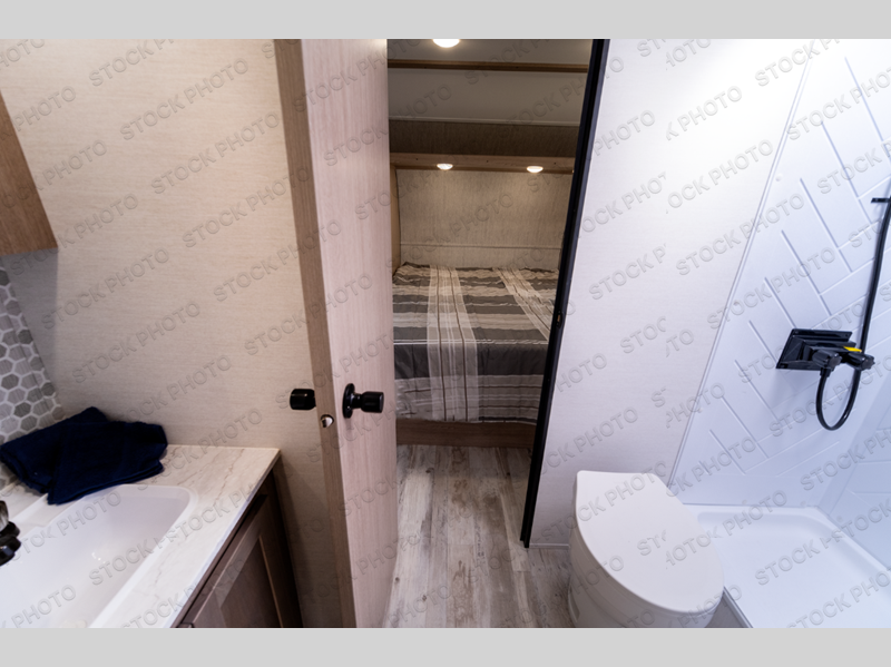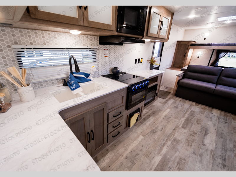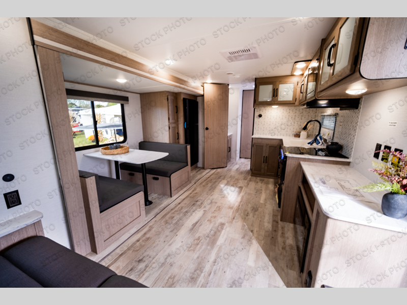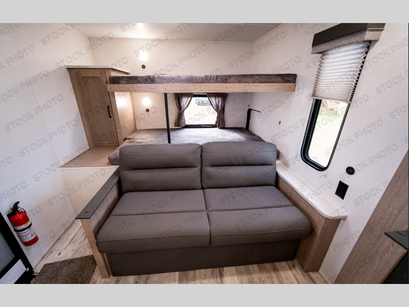 This travel trailer is perfect for a family thanks to its several spaces for rest on the road like the queen bed for you and your partner, the double size bunks for kids, and a sofa for guests, who will also have tons of fun thanks to the entertainment center place in front of the sofa. This unit also has a lot of space to store things and belongings like a closet, shirt closet, and wardrobe beside the bed, pass-thru storage ideal for all your gear, a closet beside the double-size bunk, and an overhead cabinet and pantry in the kitchen. Also, in the kitchen area, you will find a refrigerator, sink, a three-cooktop burner, and a dinette, perfect for enjoying each meal of the day. Finally, take a relaxing bath in the incredible full pass-through bathroom.