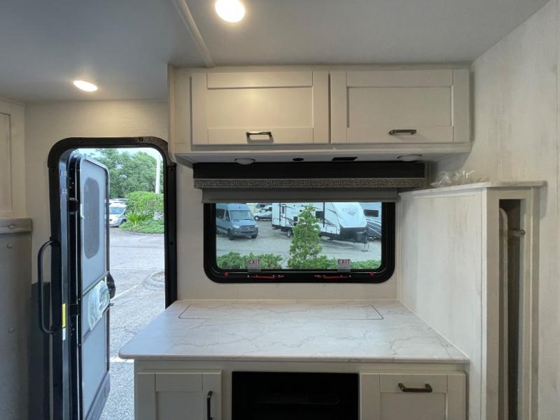 Travel to see mountains, cities, or events in this coach that offers a versatile living and sleeping space with the soft touch sofa and Murphy bed combo! You can relax indoors at the sofa and sleep in the same space at night. The kitchen area offers full amenities including a pantry to stow away the dry goods. More storage can be found in the overhead storage cabinets above the cab area which has comfortable 2-way driver and passenger seats. And this model includes a fireplace option to enjoy on fall nights!