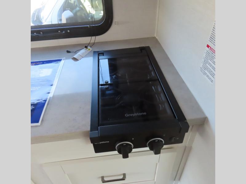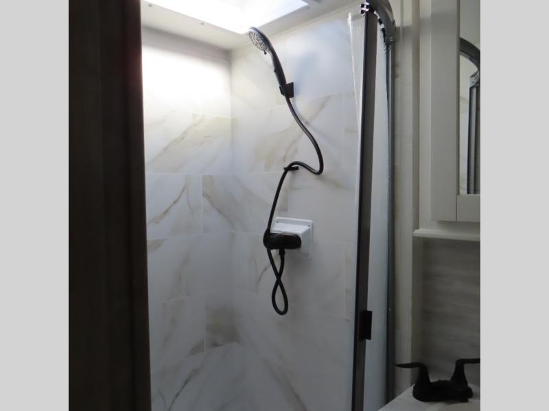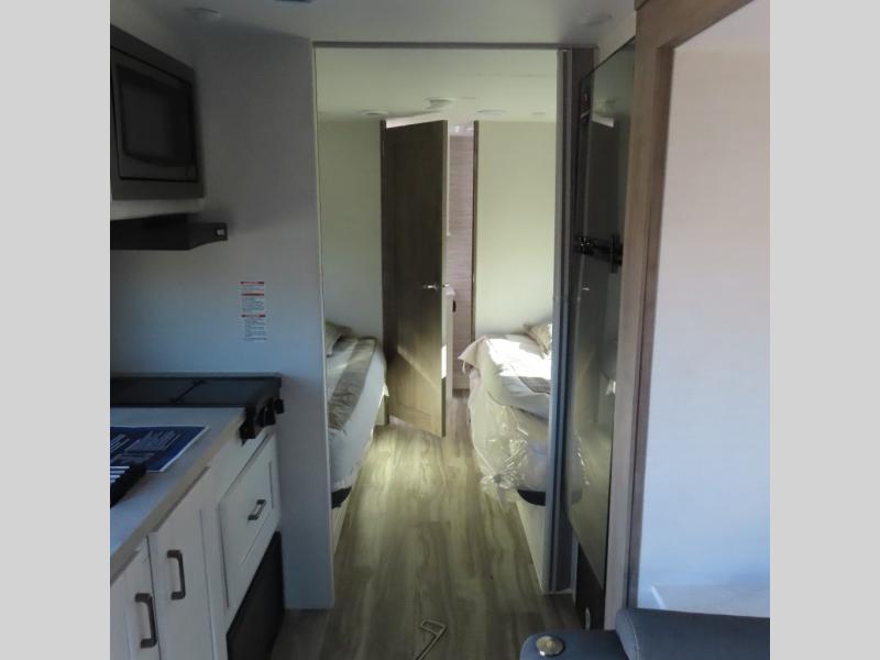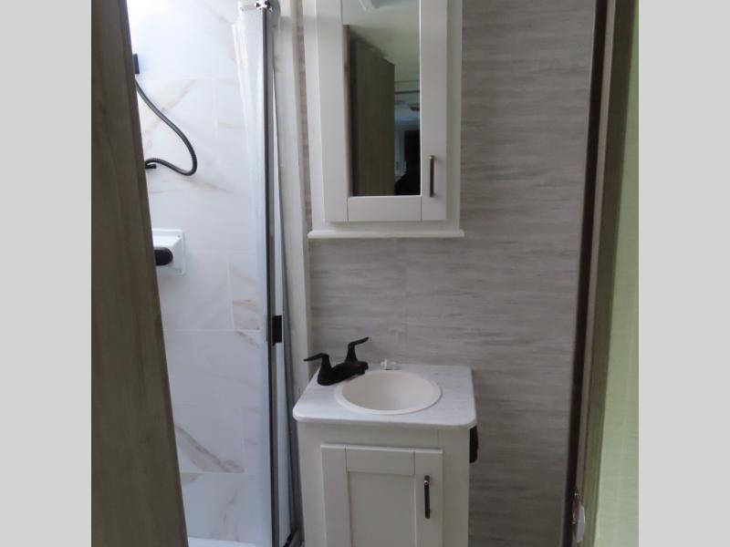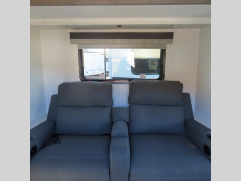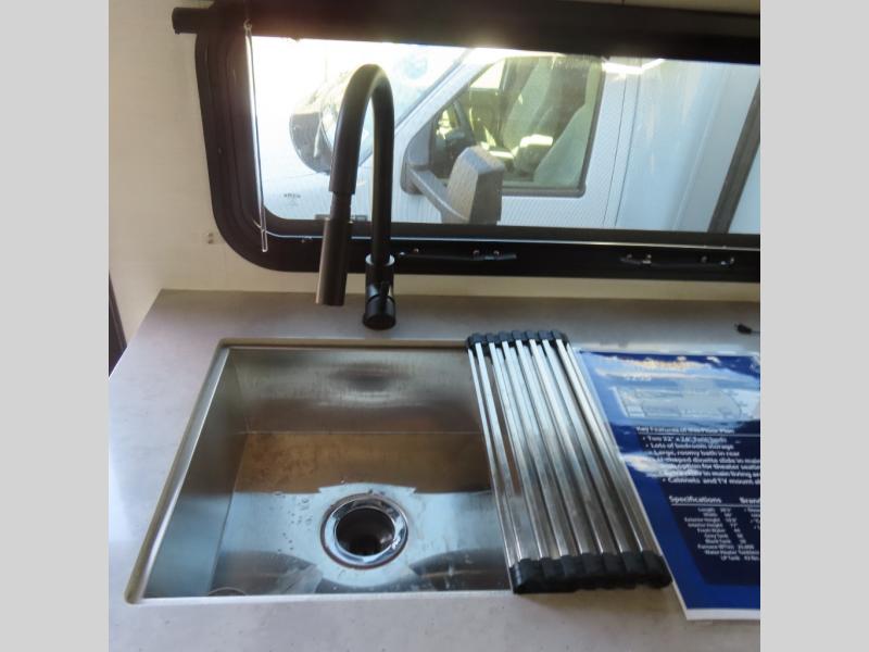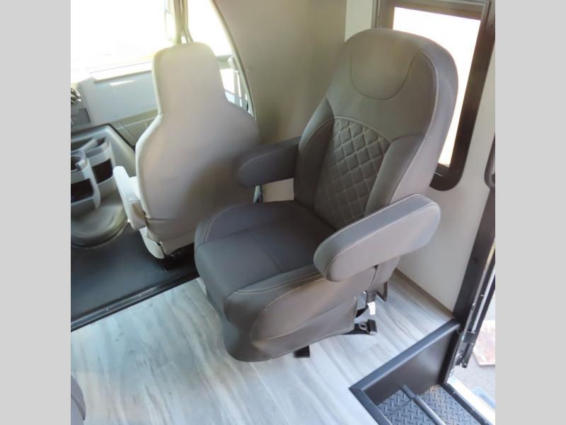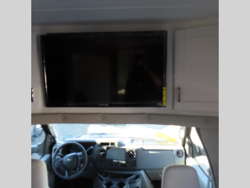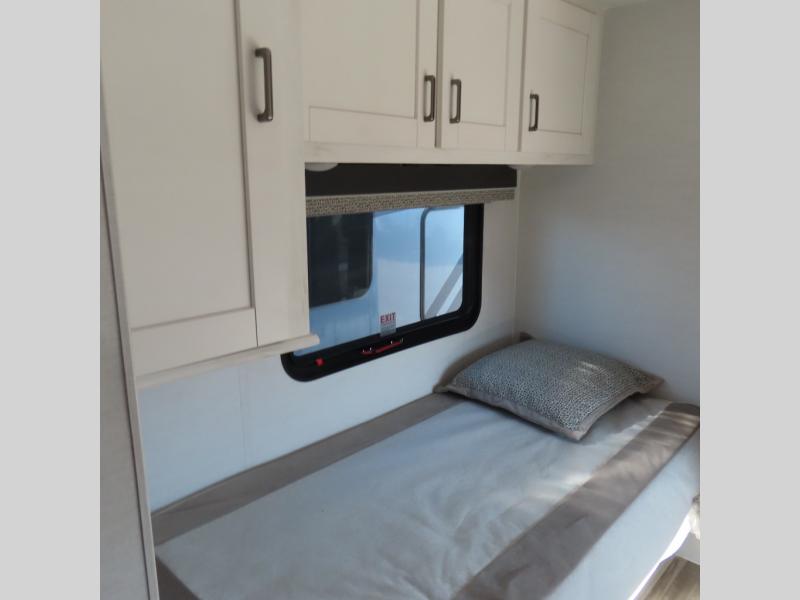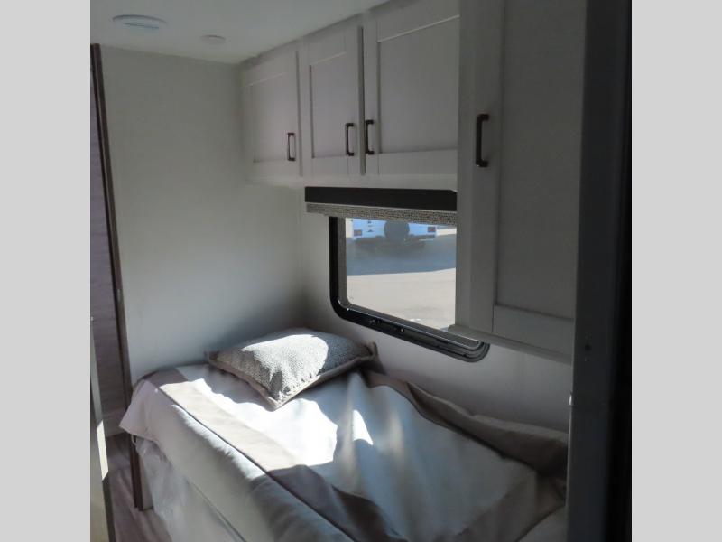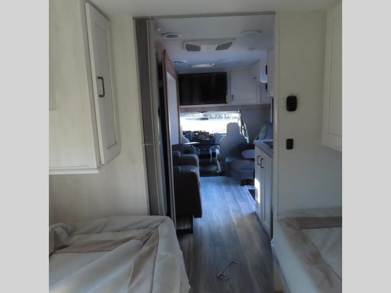 Cruise the countryside in this coach with your favorite person plus two more if you wish! The full bathroom is convenient while on the road or at your campsite and includes linen storage. You can sleep on one of the two twin beds with a center aisle to easily get to the rear bathroom or the main living and kitchen area up front. You will find overhead storage above the cab which has 2-way driver and passenger seats, plus a chair and U-shaped dinette slide to relax on. And the dinette offers sleeping space when needed. The cook can whip up a meal using the kitchen appliances and you can dine inside, or outside under the electric awning, just add your camping chairs.