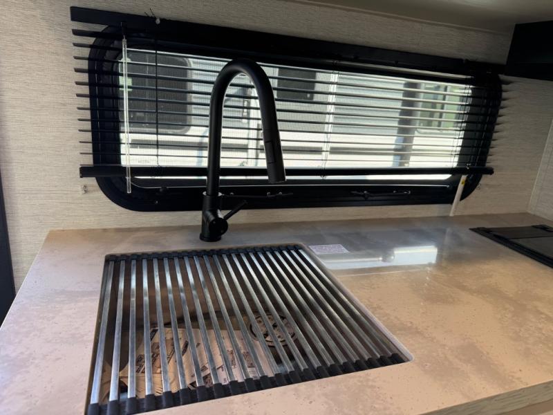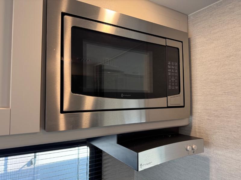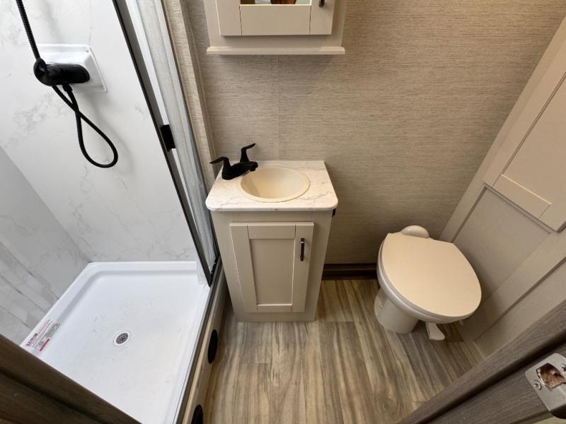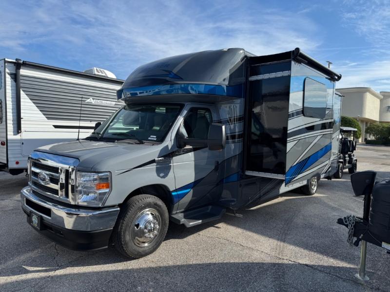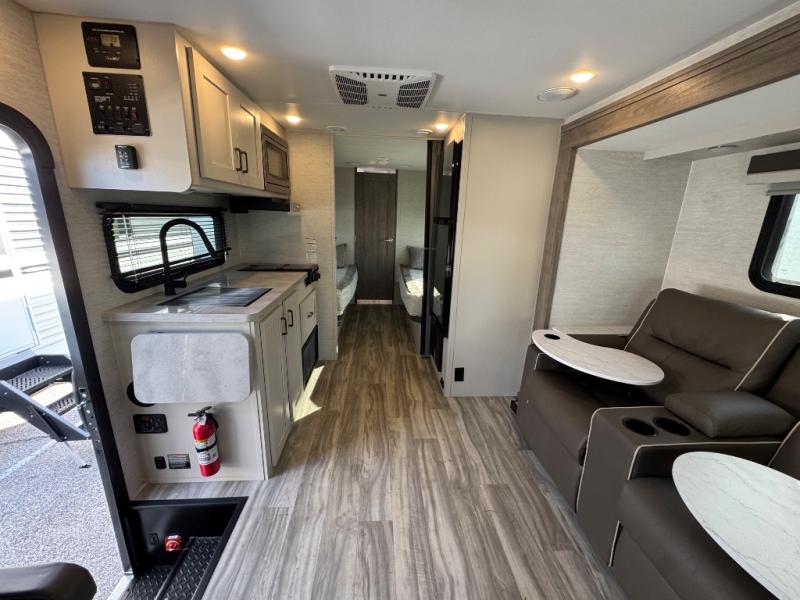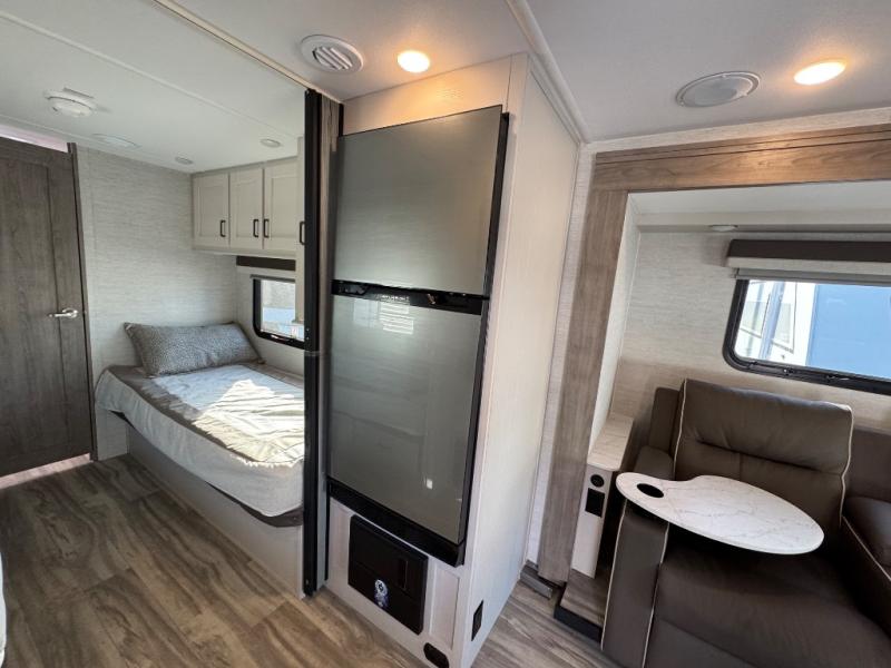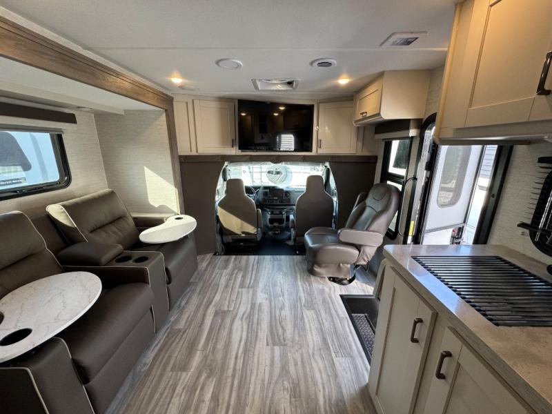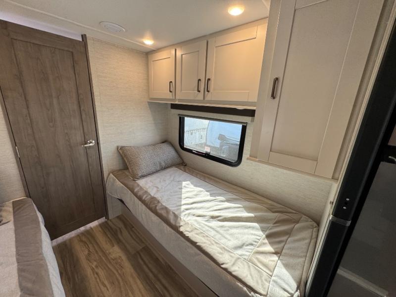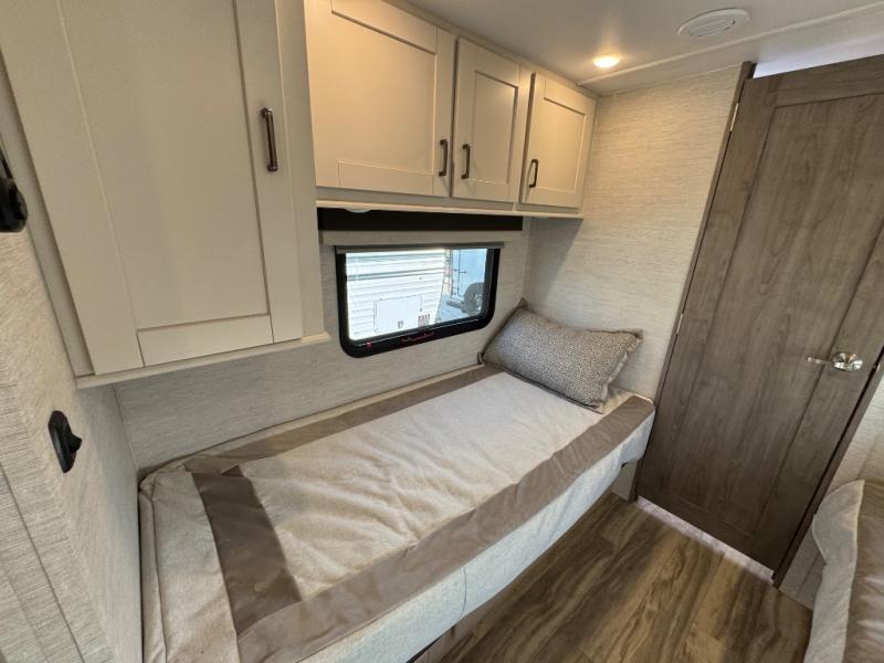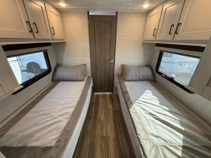 Cruise the countryside in this coach with your favorite person plus two more if you wish! The full bathroom is convenient while on the road or at your campsite and includes linen storage. You can sleep on one of the two twin beds with a center aisle to easily get to the rear bathroom or the main living and kitchen area up front. You will find overhead storage above the cab which has 2-way driver and passenger seats, plus a chair and U-shaped dinette slide to relax on. And the dinette offers sleeping space when needed. The cook can whip up a meal using the kitchen appliances and you can dine inside, or outside under the electric awning, just add your camping chairs.