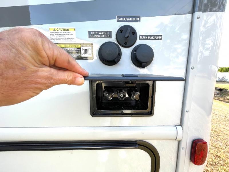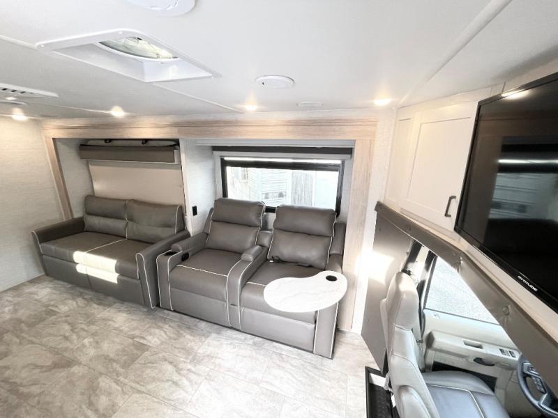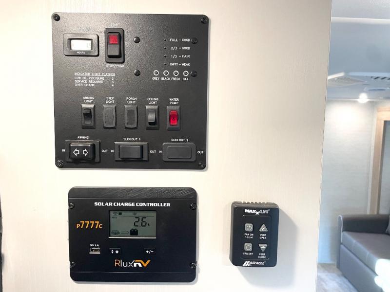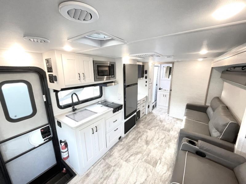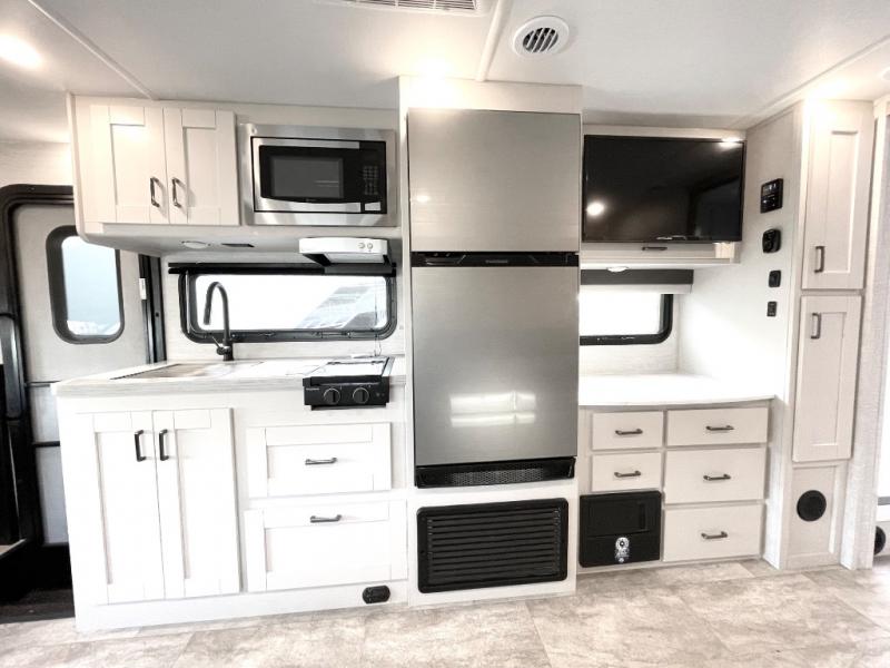 This versatile coach is ready for adventure when you are! You will love the full-wall slide that holds the booth dinette and 60" x 74" Murphy bed. Once the bed is folded up, you will enjoy the 60" electric sofa with arms. A full rear bath includes a spacious shower, toilet, vanity, plus a wardrobe and linen closet for clean towels. In the morning, you can make breakfast on the three burner range or in the microwave oven, and there is an 8 cu. ft. 12V double door refrigerator and a pantry for food storage.