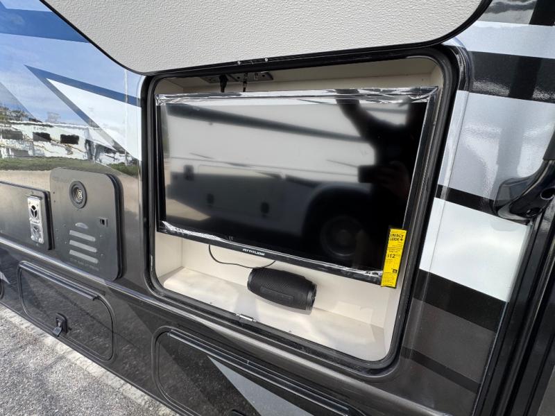Set out to new destinations with this Conquest Class C gas motorhome to travel and stay in comfort! Your family will love having their own space to sleep with the bunk over the cab, which will be a hot spot for sure, the jackknife sofa and the booth dinette in the main living area, and the RV queen bed in the rear private bedroom. The kitchen offers all the appliances necessary to keep the crew fed, like a three-burner range, a microwave oven, and a double-door 12V refrigerator/freezer. You might even decide to add the optional outdoor entertainment center for more fun.