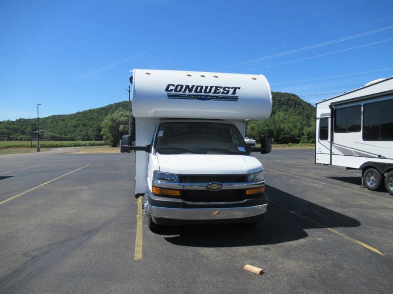 Each one of these Gulf Stream RV Conquest Class C LE Series gas motorhomes is built with a Cradle of Strength® on a Ford E350 chassis and a 7.3L V8 engine, or you can choose the optional Chevy chassis with a 6.0L V8 engine! Their construction also consists of a welded aluminum perimeter frame, an EPDM rubber roof, and a white fiberglass exterior that is ultra slick. There is solid wood cabinetry inside, along with upgraded interior fabrics, and two decor choices to best fit your style.