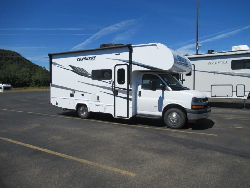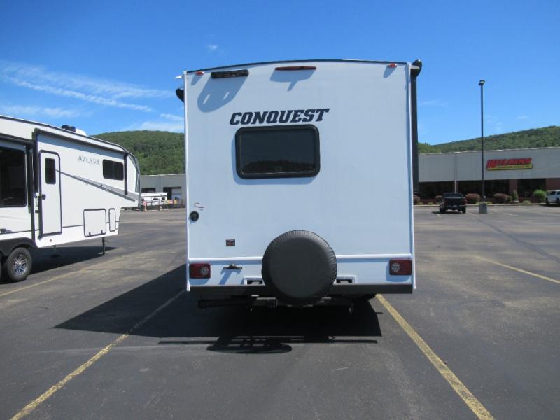 This Conquest Class C LE Series gas motorhome is a real treat to have as you cross the country making your way to scenic destinations! You will find an RV queen bed in the back of this coach so that you can stop and rest your head whenever it is convenient for you, and you will also be able to whip up a meal at any time with the three-burner range in the kitchen. The refrigerator will store your dairy and produce so that it is fresh and ready to be snacked on, and you will enjoy having a closet to use for various items, like your garments or cleaning supplies.