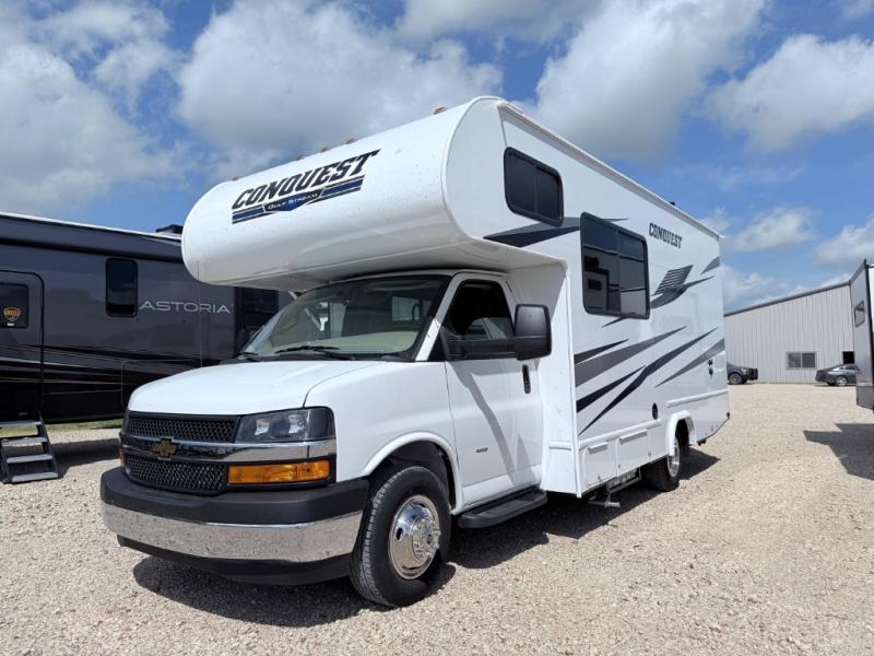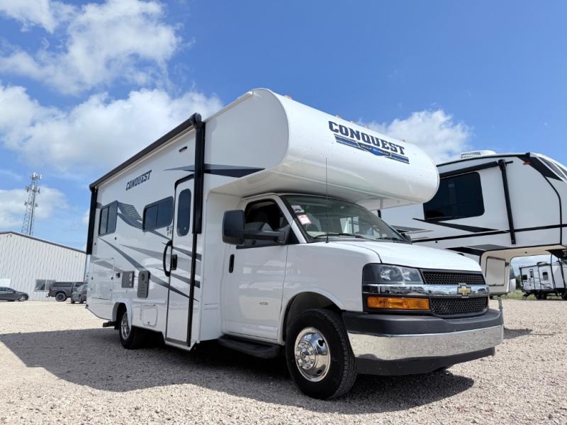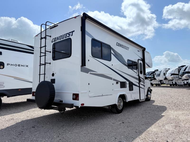 Each one of these Gulf Stream RV Conquest Class C LE Series gas motorhomes is built with a Cradle of Strength® on a Ford E350 chassis and a 7.3L V8 engine, or you can choose the optional Chevy chassis with a 6.0L V8 engine! Their construction also consists of a welded aluminum perimeter frame, an EPDM rubber roof, and a white fiberglass exterior that is ultra slick. There is solid wood cabinetry inside, along with upgraded interior fabrics, and two decor choices to best fit your style.
