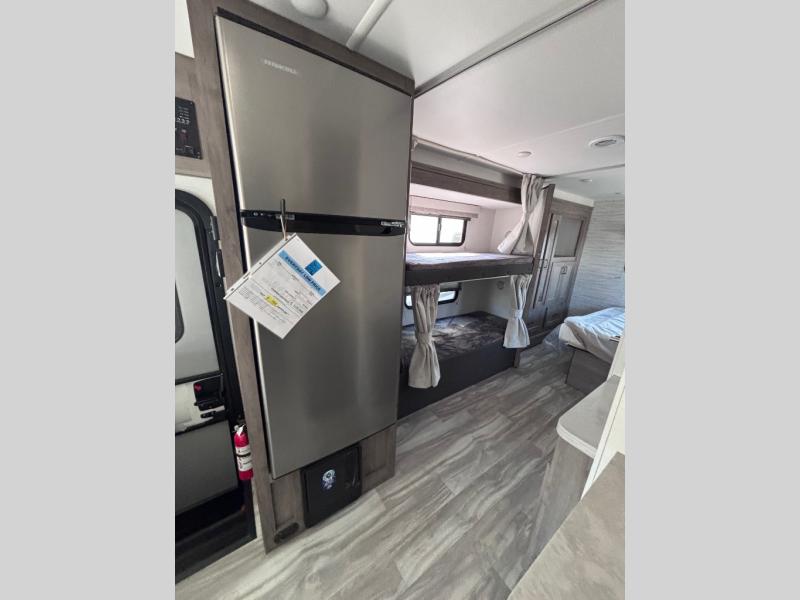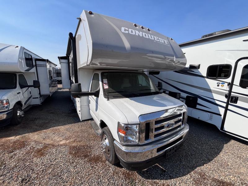Looking for space for everyone and everything on your next road trip? With this Conquest Class C gas motorhome, you will find exterior and interior storage throughout including a bedroom wardrobe, overhead cabinets, and exterior basement storage. You will find sleeping space on the RV queen bed in the private bedroom, the set of bunk beds across from the bathroom, and the bunk over the cab. Additional sleeping space can be created when you maneuver the jackknife sofa and booth dinette into place. If you enjoy cooking, the kitchen has what you need with its three-burner cooktop, microwave oven, and 10.2 cu. ft. 12V double door refrigerator/freezer!