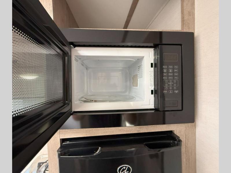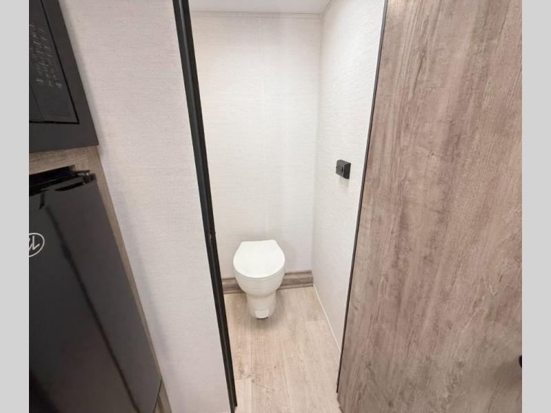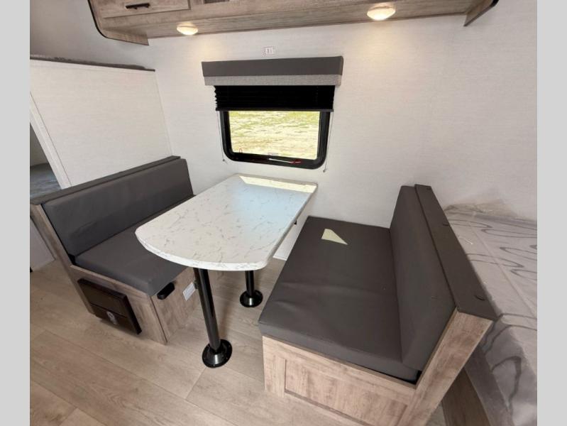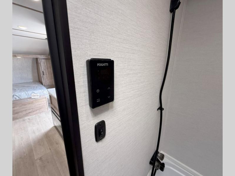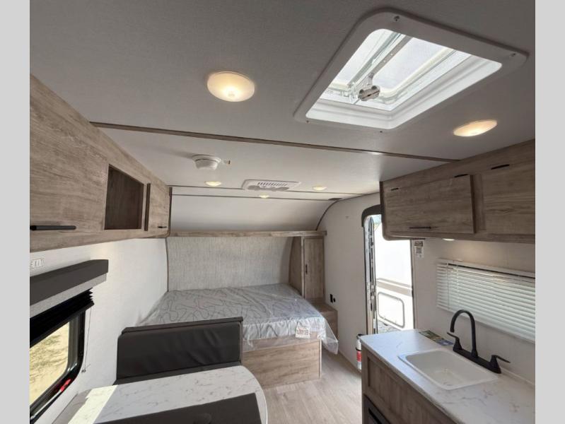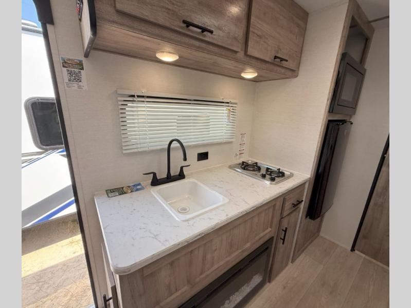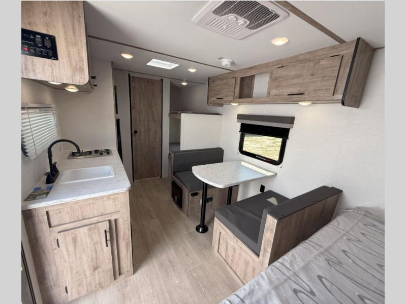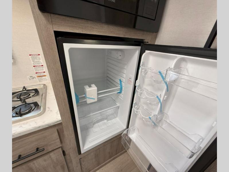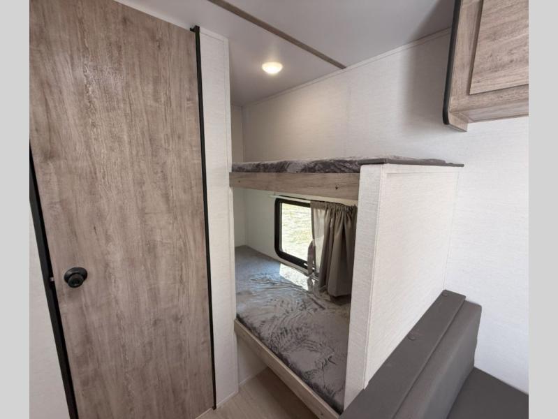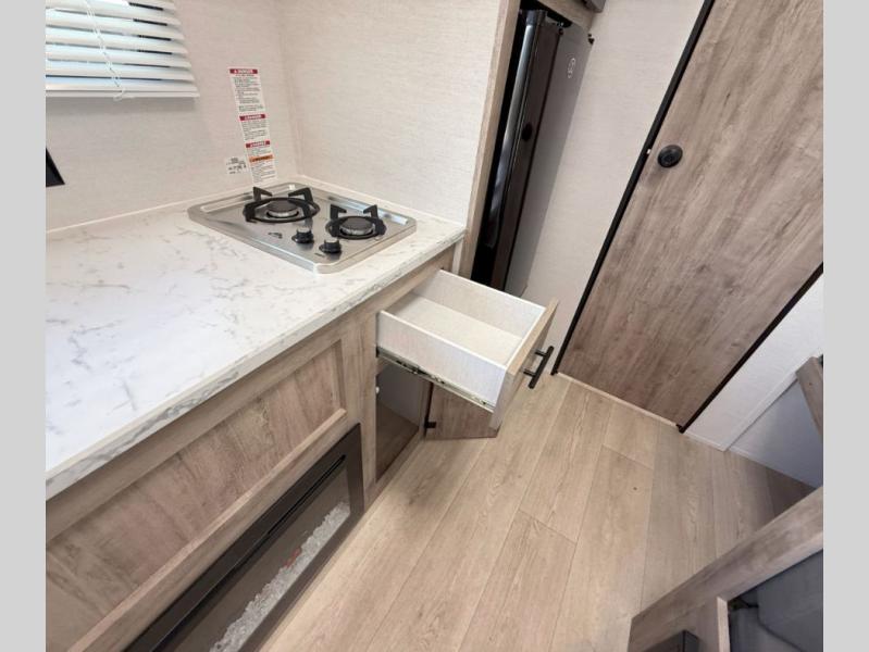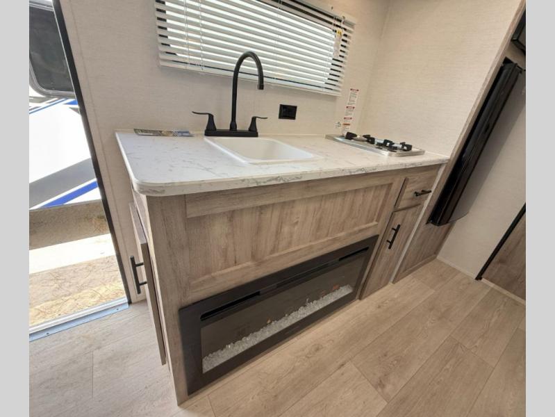 Your family or group of five will feel right at home in this cozy travel trailer. There is a front corner bed with a night stand for your things, bunk beds for the little ones, plus a booth dinette that can double as dining and sleeping space. The private toilet and shower will allow you to stay clean throughout your trip, and since the sink is in the kitchen, one camper can shower, while the other brushes their teeth. You'll find everything you need to prepare meals each day, including a two burner cooktop, a microwave oven, plus a refrigerator for perishables. This model also includes a fireplace to take the chill out and create a more home-like feel!
