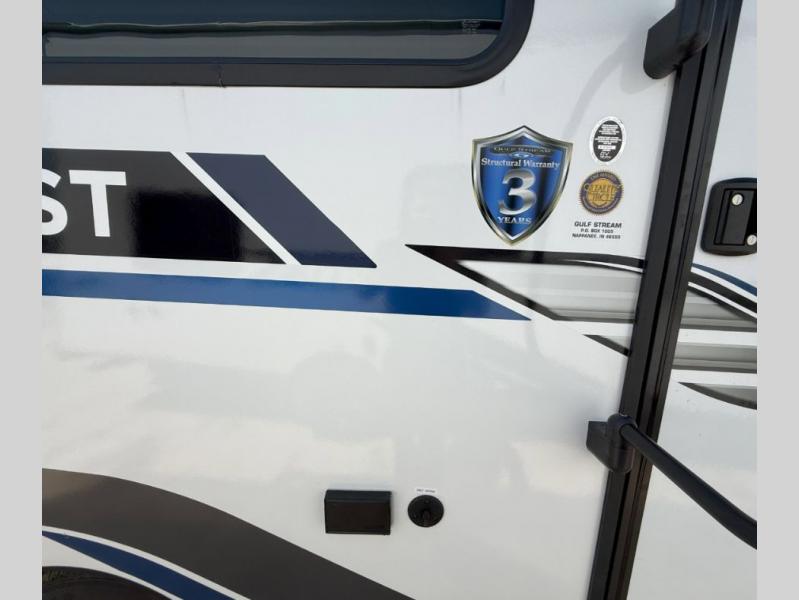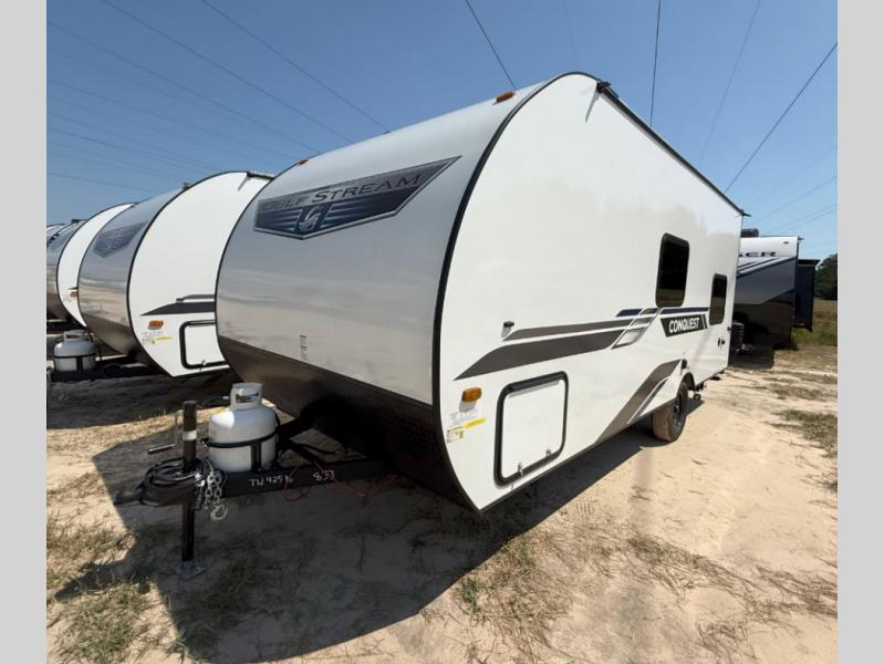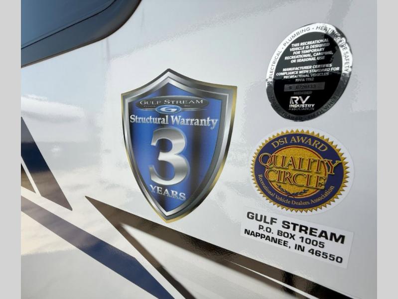 You will find that each one of these Gulf Stream Conquest Super Lite travel trailers offer top quality, roomy, comfortable accommodations, and well-proven models inspired by those who enjoy the outdoors! There are built with a solid construction with a seamless synthetic vinyl roof, diamond plate lower front, radius safety glass windows. Underneath the high-performance vinyl flooring throughout is a tubular steel frame that holds these units together. The craft-made cabinetry provides a stylish storage space, and the multiple USB power outlets are found in the handiest places to keep your electronics charged for the whole trip. There are many standard features which will make camping easier, but you might also want to add a few optional features too like the double SolidStep® entry step or the Bluetooth radio with two interior and two exterior speakers to crank up the tunes!