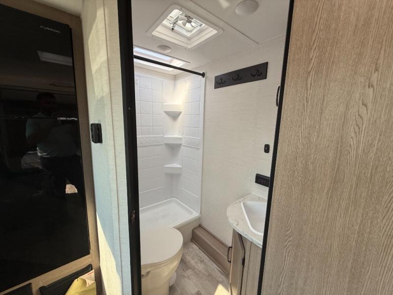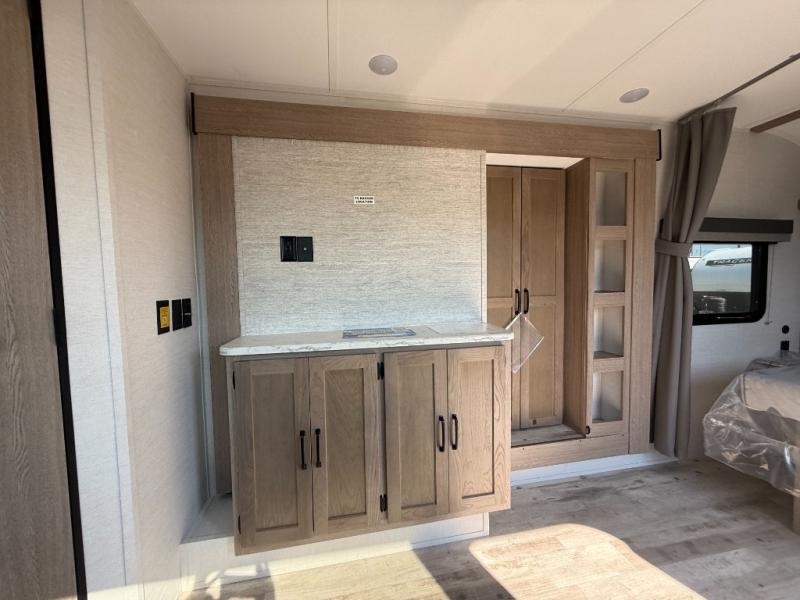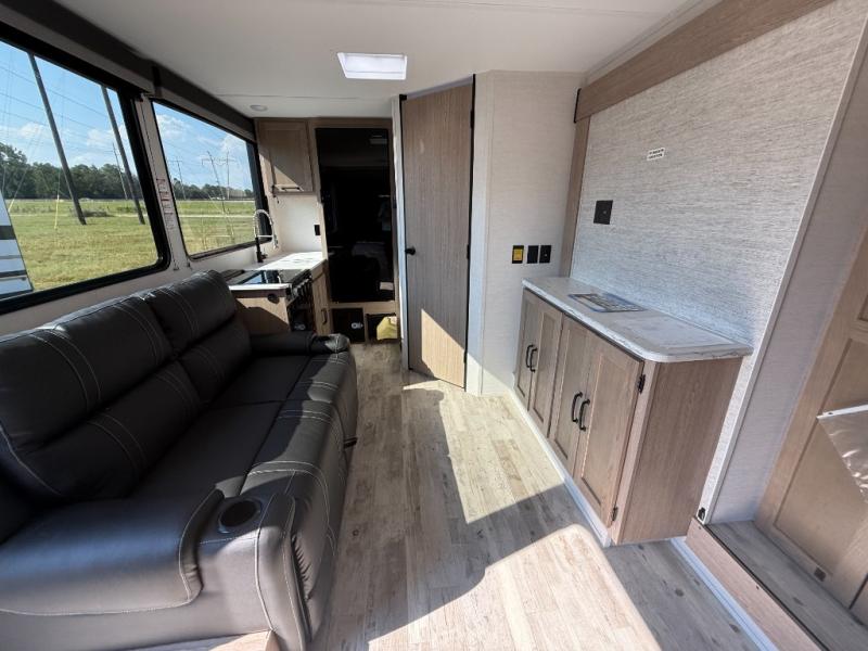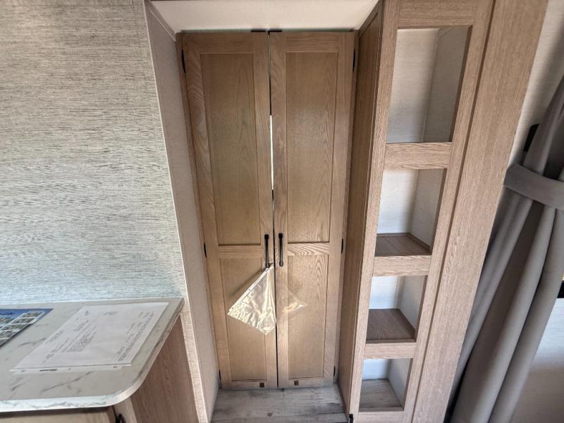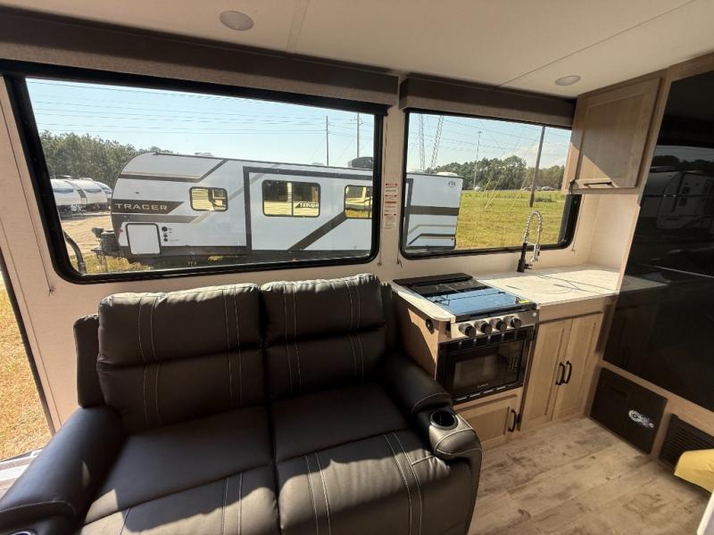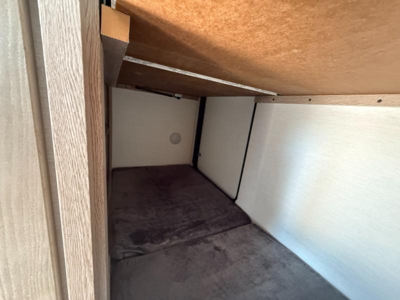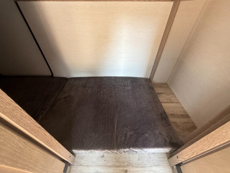 This travel trailer is perfect for a family thanks to its several spaces for rest on the road like the queen bed for you and your partner, the upper and lower bunks for kids, and a folding sofa table for guests, who will also have tons of fun thanks to the entertainment center place In front of the sofa. This unit also has a lot of space to store things and belongings like a shirt closet and wardrobe closet beside the bed, bunk shelves next to the bunk beds, and a sliding overhead cabinet in the kitchen. Also, you will find a refrigerator, sink, and a three-cooktop burner in the kitchen area. Finally, take a relaxing bath in the incredible full bathroom with a skylight