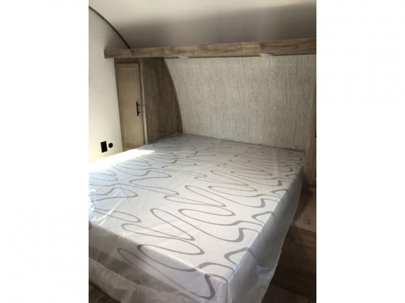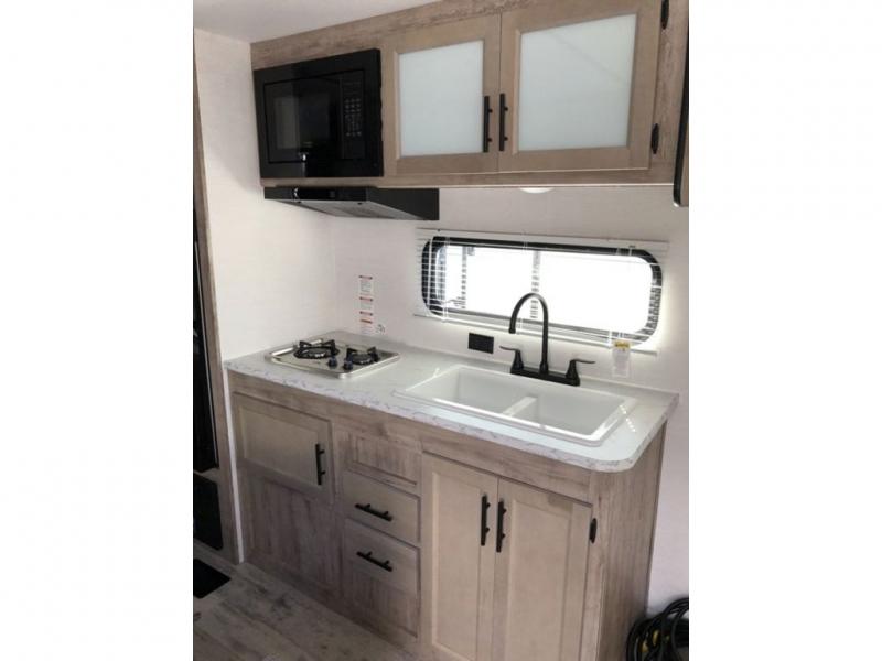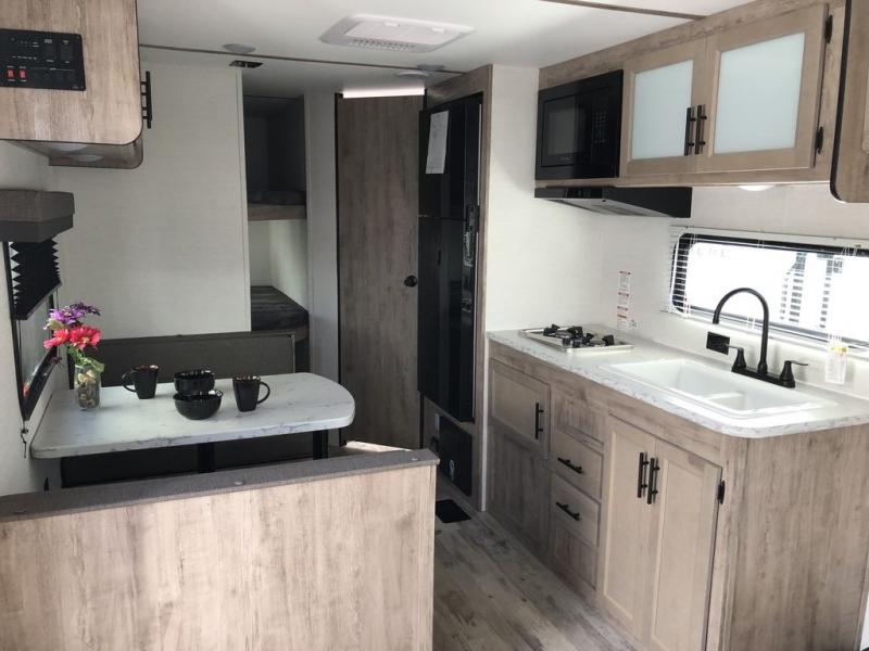 Luxurious double-size bunks provide a restful retreat for kids or guests, while a fully-equipped bathroom offers ultimate relaxation. A stylish booth dinette creates a warm and inviting atmosphere, perfect for sharing meals and playing board games with your loved ones. In the kitchen area, a spacious refrigerator keeps your fruits and vegetables fresh, and a convenient microwave makes meal prep a breeze. Ample overhead cabinets provide additional storage, and a high-performance three-burner cooktop offers endless culinary possibilities. Further, a versatile convertible sofa provides a comfortable seating area by day and a cozy sleeping area by night. The serene front bedroom features a plush queen bed, dual closets, and overhead cabinets for abundant storage. In the exterior, generous pass-through storage provides additional space for gear and equipment.