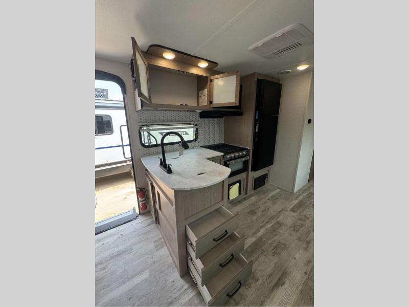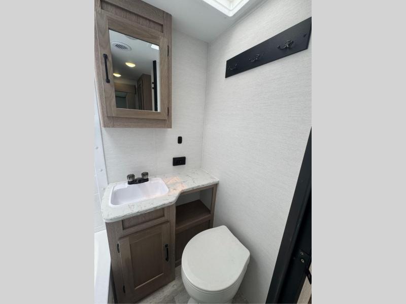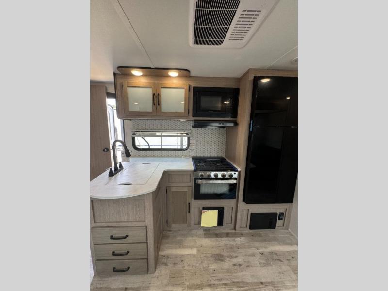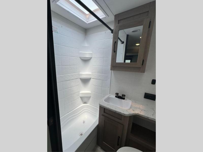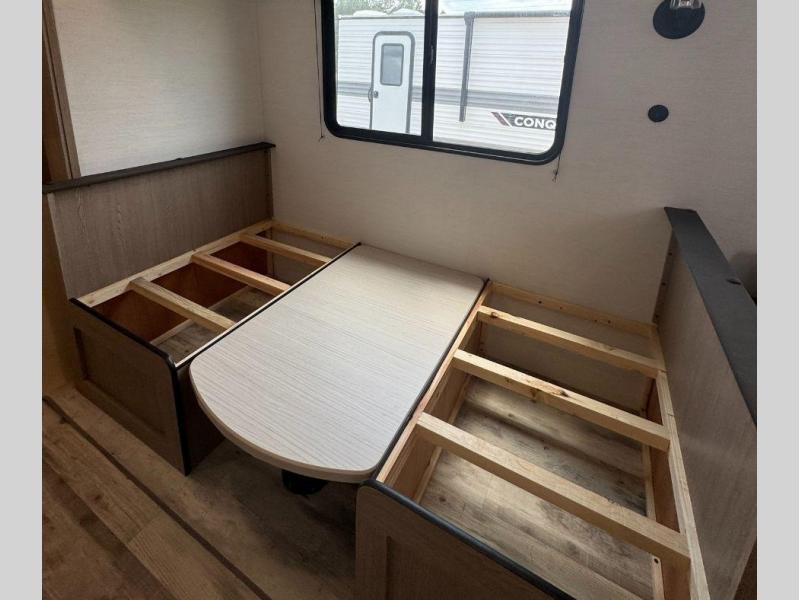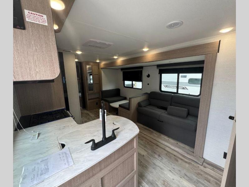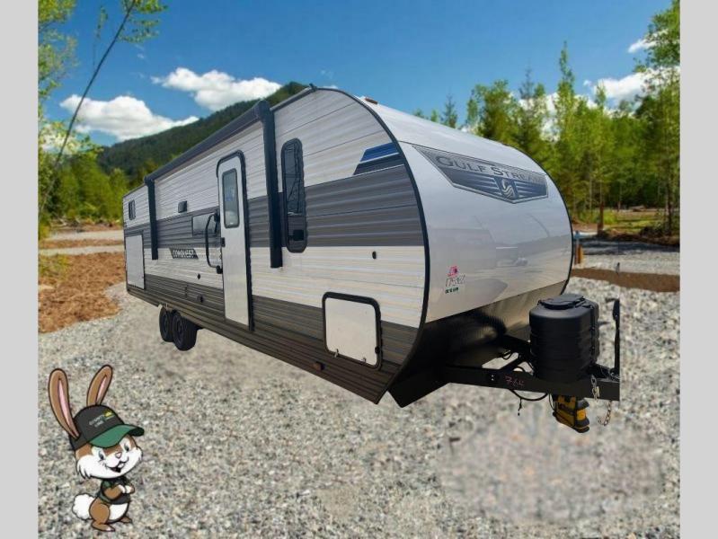 With any Conquest Ultra Lite travel trailer by Gulf Stream RV, you begin with an unibody construction with steel hurricane straps, fortifying walls to roof and floor for unmatched stability and peace of mind. Each unit is equipped with 30 Amp service, a 45 Amp converter, and charger, providing robust power for all your needs. The interior offers exquisite craft-made cabinetry with stunning hardwood cabinet doors, a sleek central control panel streamlines system managements while radius safety glass windows offer breathtaking views, and privacy drapes provide added serenity, furthermore, the skylight over the tub bathes the bathroom in natural light, creating a spa-like ambiance. Make your selection today and enjoy an affordable and comfortable way to camp!