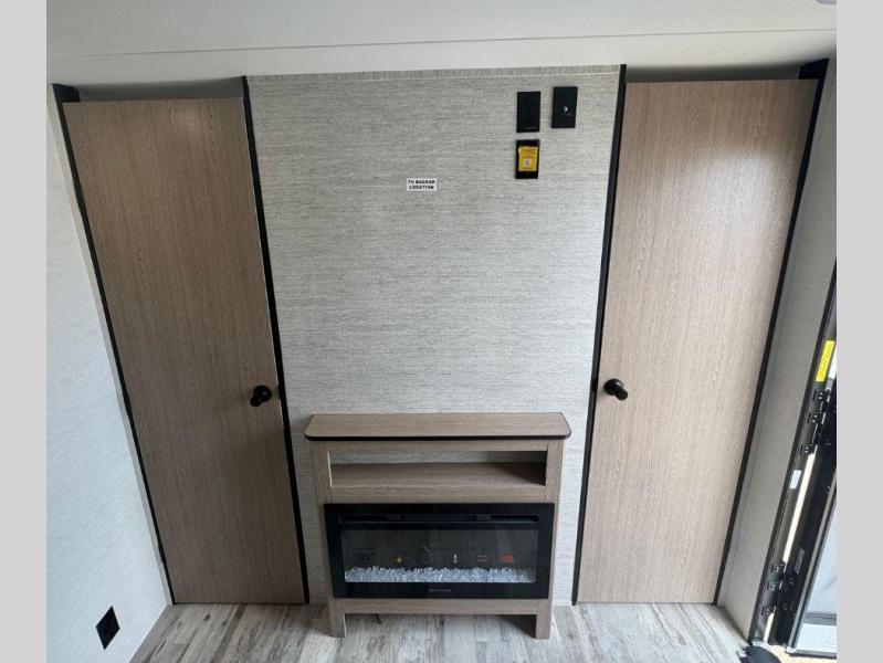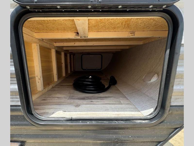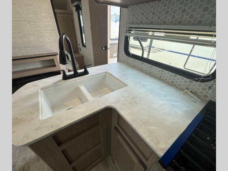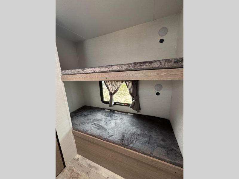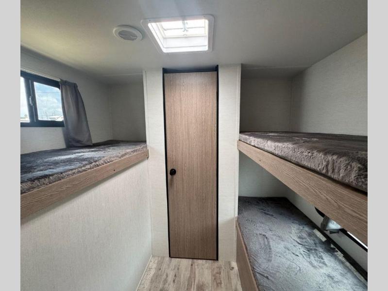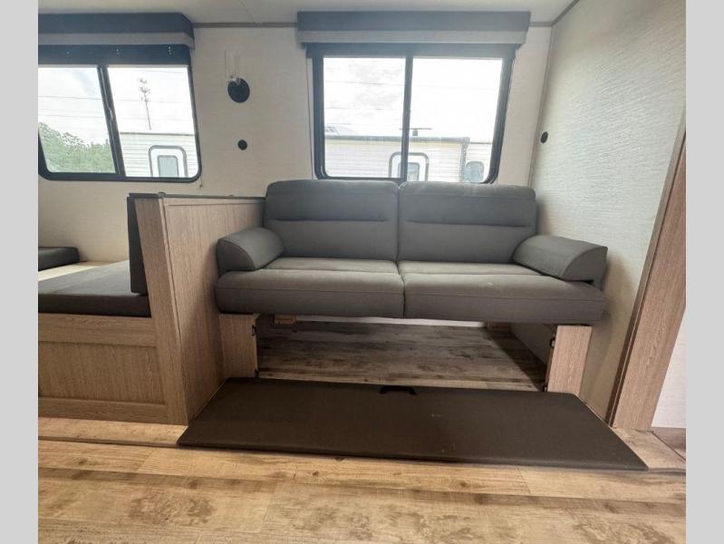If you have kids or friends that you want to vacation with, the private bunkhouse with quad bunks on this trailer will be their favorite indoor space! If you only need three bunks, you can choose to add the optional outside kitchen for more choices when cooking and one less bunk bed inside. The cook will also have full amenities inside to keep everyone fed, and the L-shaped counter offers a place to dry dishes next to the kitchen sink. The large slide out in the main area includes a booth dinette and sofa to enjoy while inside, plus they double as extra sleeping space. And the electric awning offers an outdoor living space for you to add your camping chairs taken from the pass-through storage.
