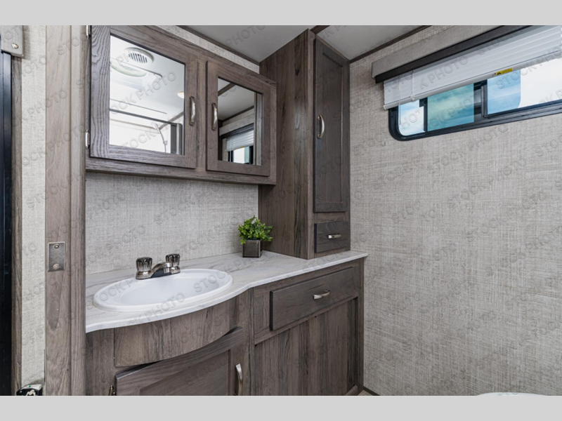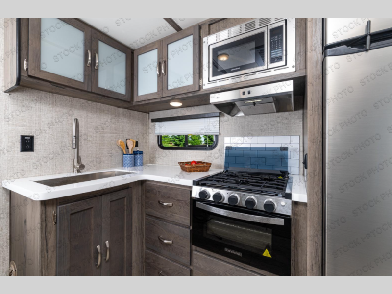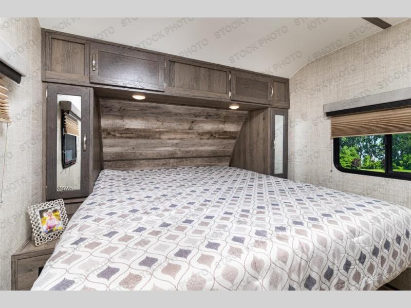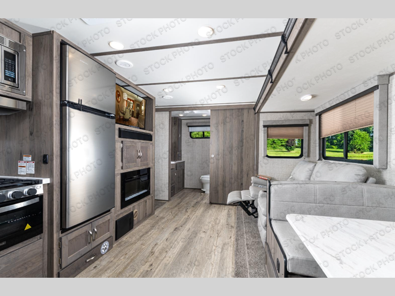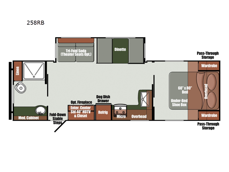 Trips to the lake are made complete with this travel trailer in tow! You will love the amount of interior space provided by the large slide out, and here you can dine at the booth dinette and relax on the tri-fold sofa. Choose the optional theatre seats if you're not needing the additional sleeping space. An optional fireplace can be added under the standard entertainment center with a 40" HDTV, and there is a closet here for storage space. You will feel right at home in the front private bedroom that includes a queen bed, dual wardrobes, plus an under-bed shoe box. In the morning you can make breakfast on the stainless steel three burner cooktop, and there is a convenient dog dish drawer for your furry friends!