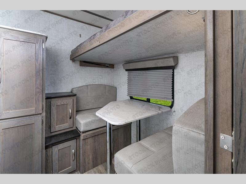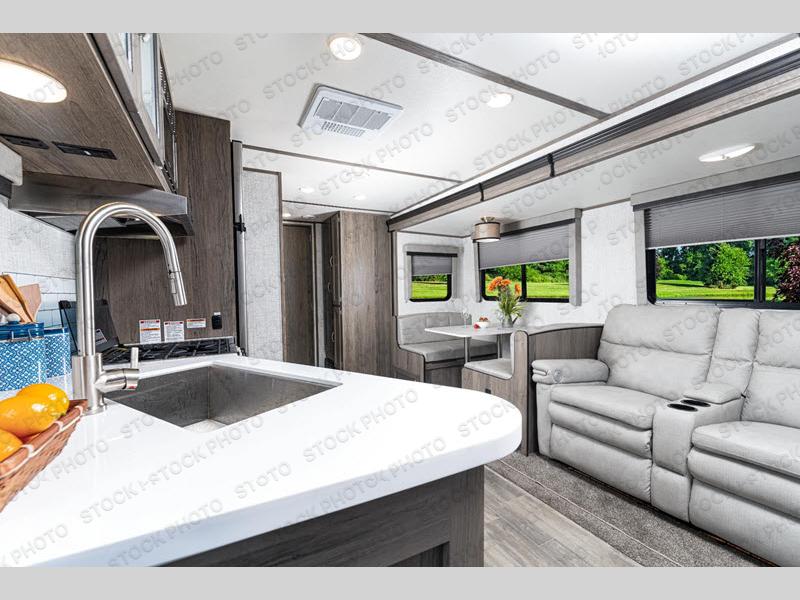 The ultimate travel trailer for whole-family fun is found in this travel trailer! Your guests or the kids will love the private bunkhouse three bunks and a booth dinette. The front private bedroom includes a queen bed and dual wardrobes to keep all your clothes tidy, and any additional guests can sleep on the tri-fold sofa and booth dinette in the living area within the large slide out. There is an entertainment center with a TV for movie marathons on those rainy days, and if the weather is just right, you may want to head outdoors to relax under the power awning with LED lights. The lawn chairs can be unpacked from the pass-through storage, and you can add the optional outside kitchen for even more fun!