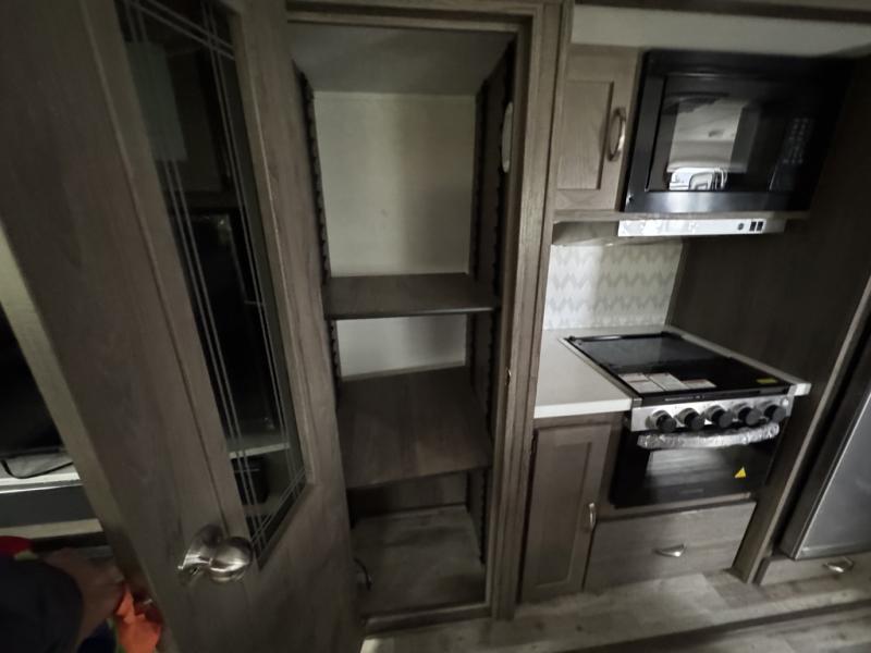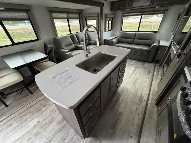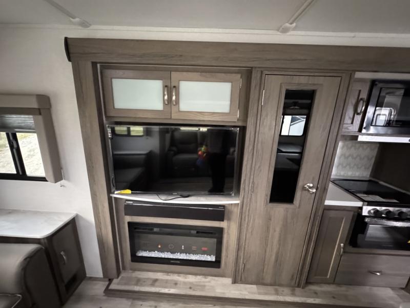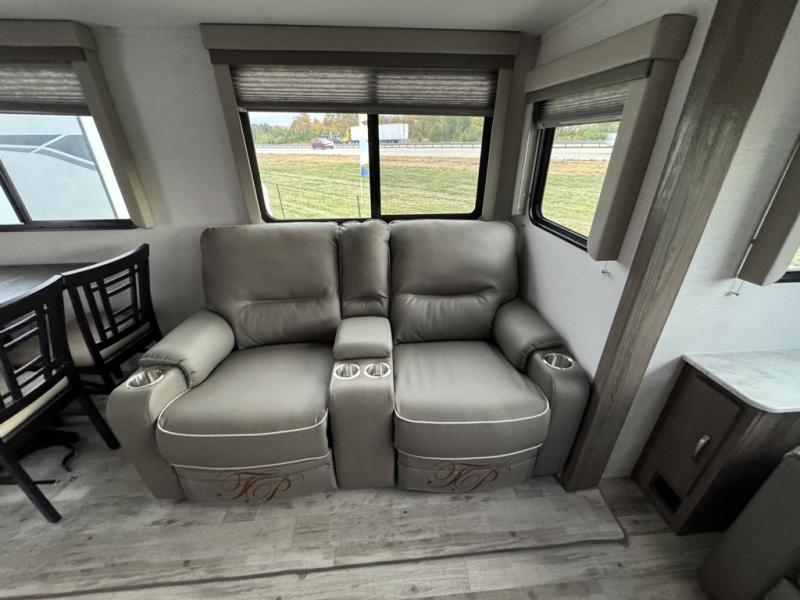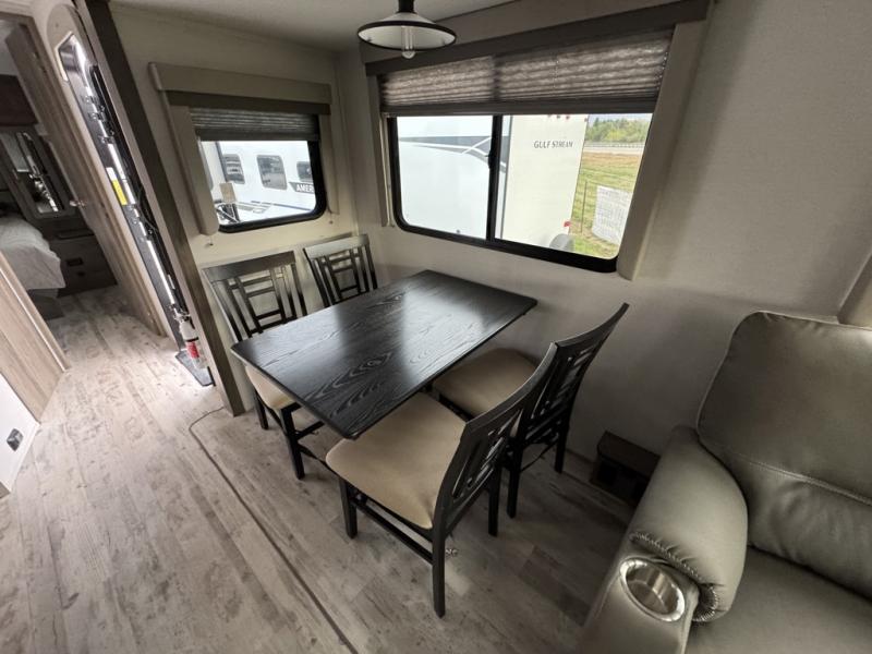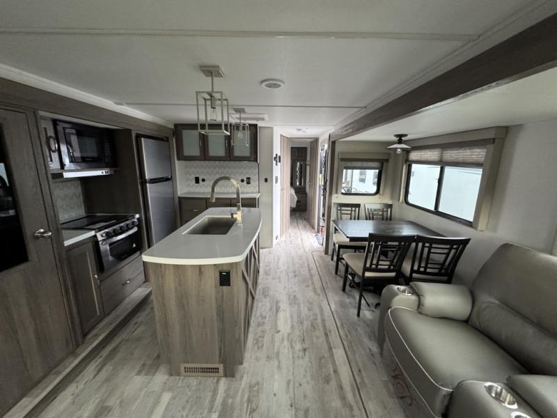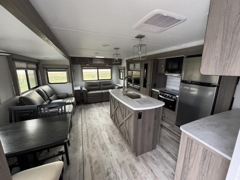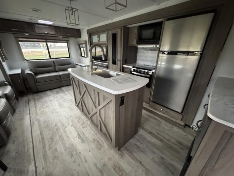 This travel trailer will feel more like home with its dual opposing slides for maximum space. The kitchen island will be a big plus with the chef of your group, plus there is an appliance center, a spacious pantry, and pull-down faucet with a sprayer for easy clean up. You'll find plenty of comfortable seating spaces on the two tri-fold sofas and the booth dinette, and you can even option one of the tri-fold sofas out for optional theater seats if you choose. Head to the front private bedroom after a day in the sun where you can grab your comfy clothes from the dual wardrobes and crash on the queen bed!
