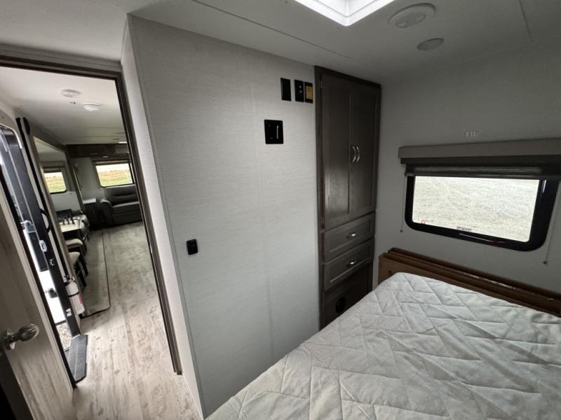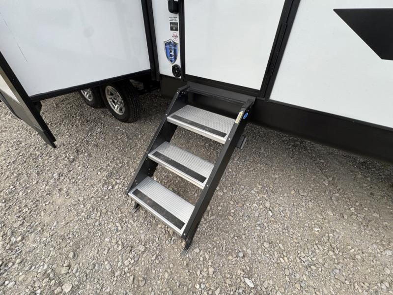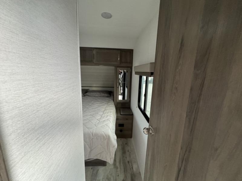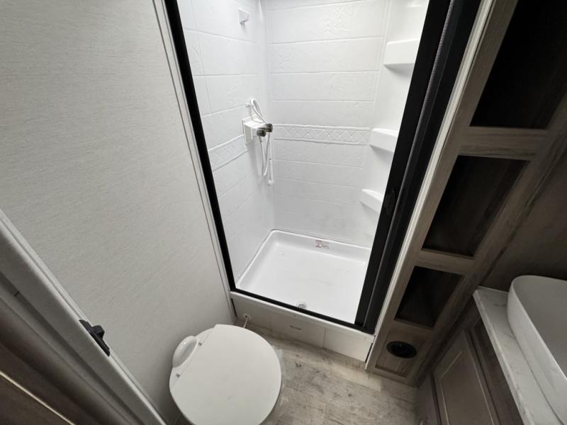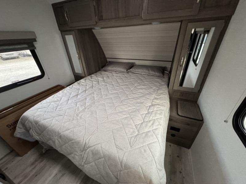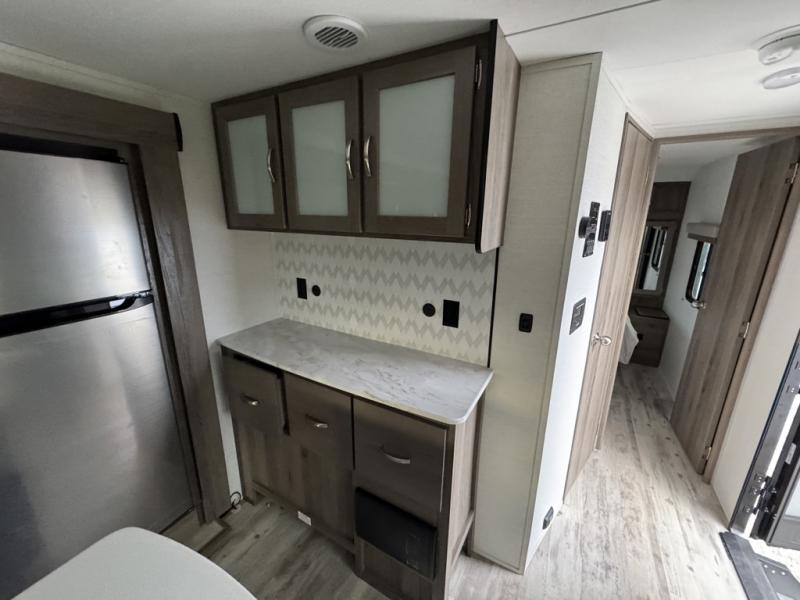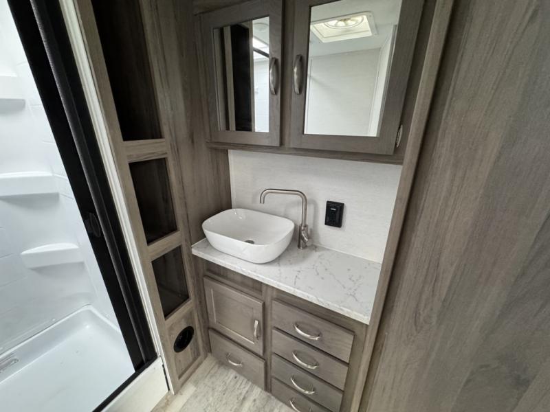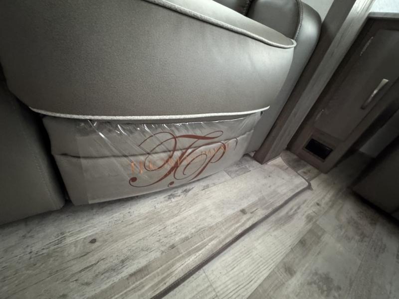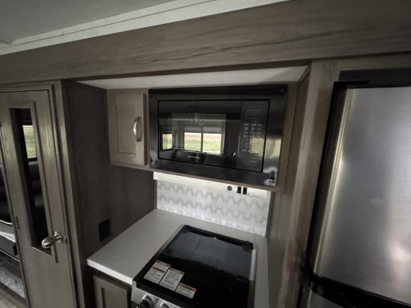 This travel trailer will feel more like home with its dual opposing slides for maximum space. The kitchen island will be a big plus with the chef of your group, plus there is an appliance center, a spacious pantry, and pull-down faucet with a sprayer for easy clean up. You'll find plenty of comfortable seating spaces on the two tri-fold sofas and the booth dinette, and you can even option one of the tri-fold sofas out for optional theater seats if you choose. Head to the front private bedroom after a day in the sun where you can grab your comfy clothes from the dual wardrobes and crash on the queen bed!
