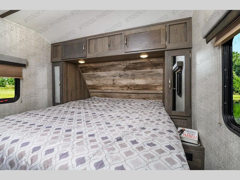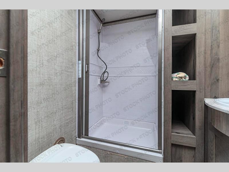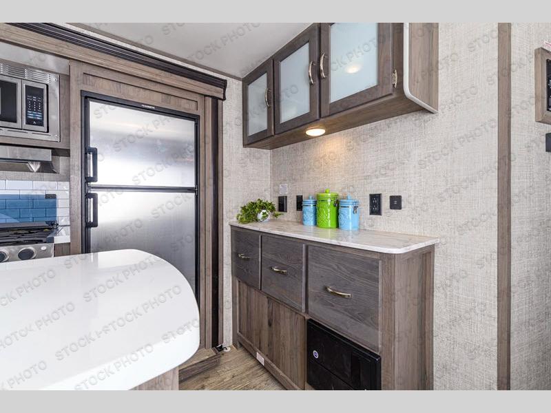 This travel trailer will feel more like home with its dual opposing slides for maximum space. The kitchen island will be a big plus with the chef of your group, plus there is an appliance center, a spacious pantry, and pull-down faucet with a sprayer for easy clean up. You'll find plenty of comfortable seating spaces on the two tri-fold sofas and the booth dinette, and you can even option one of the tri-fold sofas out for optional theater seats if you choose. Head to the front private bedroom after a day in the sun where you can grab your comfy clothes from the dual wardrobes and crash on the queen bed!