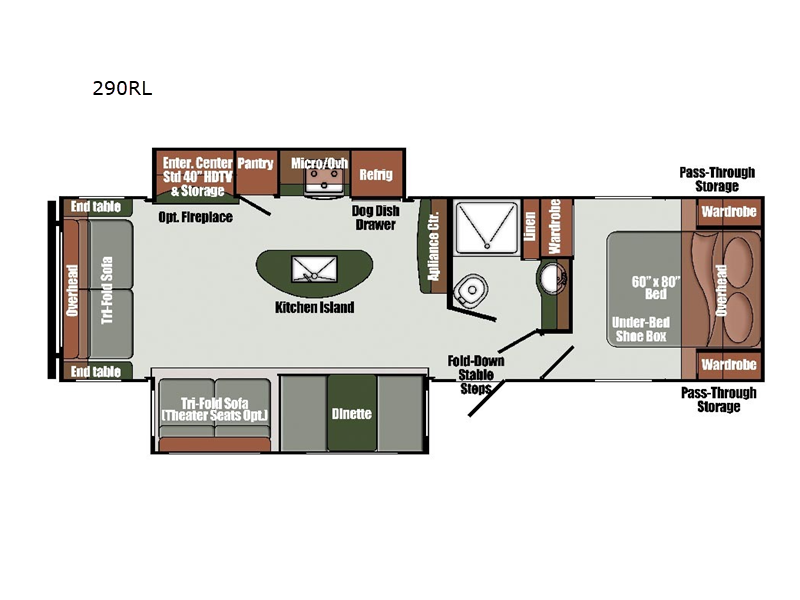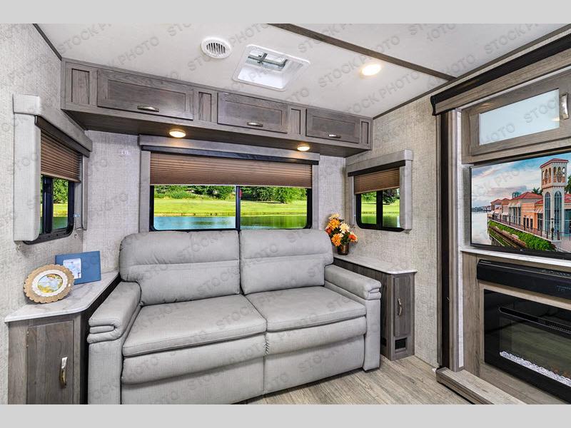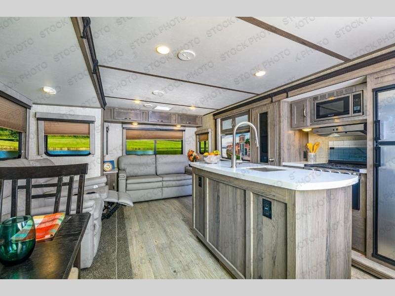 This travel trailer will feel more like home with its dual opposing slides for maximum space. The kitchen island will be a big plus with the chef of your group, plus there is an appliance center, a spacious pantry, and pull-down faucet with a sprayer for easy clean up. You'll find plenty of comfortable seating spaces on the two tri-fold sofas and the booth dinette, and you can even option one of the tri-fold sofas out for optional theater seats if you choose. Head to the front private bedroom after a day in the sun where you can grab your comfy clothes from the dual wardrobes and crash on the queen bed!