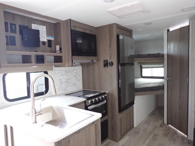 The whole gang can tag along in this travel trailer with a slide out for more space and double-size bunks! The dual shirt closets on either side of the bed will let you keep your things organized, and there is a wardrobe beside the booth dinette for even more storage. A three burner range and a microwave oven will let you make breakfast, and a 10.7 cu. ft. 12V refrigerator can store the milk and eggs. If the weather is nice, you may just find yourselves outdoors to cook on the outside kitchen with a pull-out flat top grill!