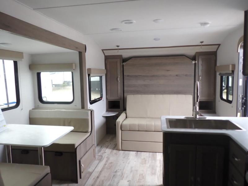 Each Envision Signature Series travel trailer by Gulf Stream is constructed with a one-piece rubber roof and fiberglass exterior sidewalls with Azdel for added strength and support. There is also a power tongue jack, an outside spray port, an electric awning with LED lights, plus more convenient features found within the Signature Package. The wood cabinet doors inside will have you feeling right at home, along with soft-pleated night shades, countertops with continuous-edge moulding, and vinyl flooring. Each model also includes tech-ready features, such as Wi-Fi and solar panel ready plus back-up camera prep if you want to add these conveniences.