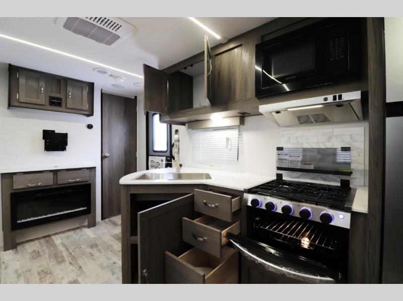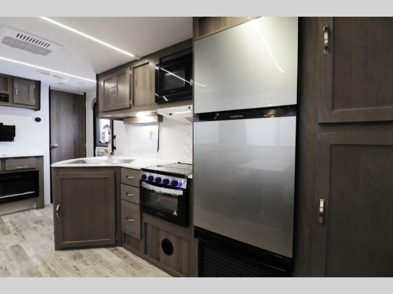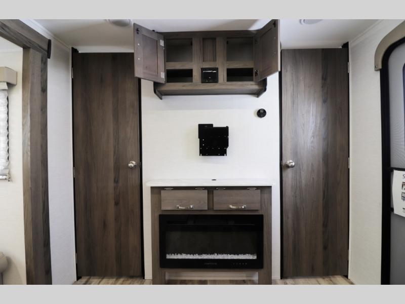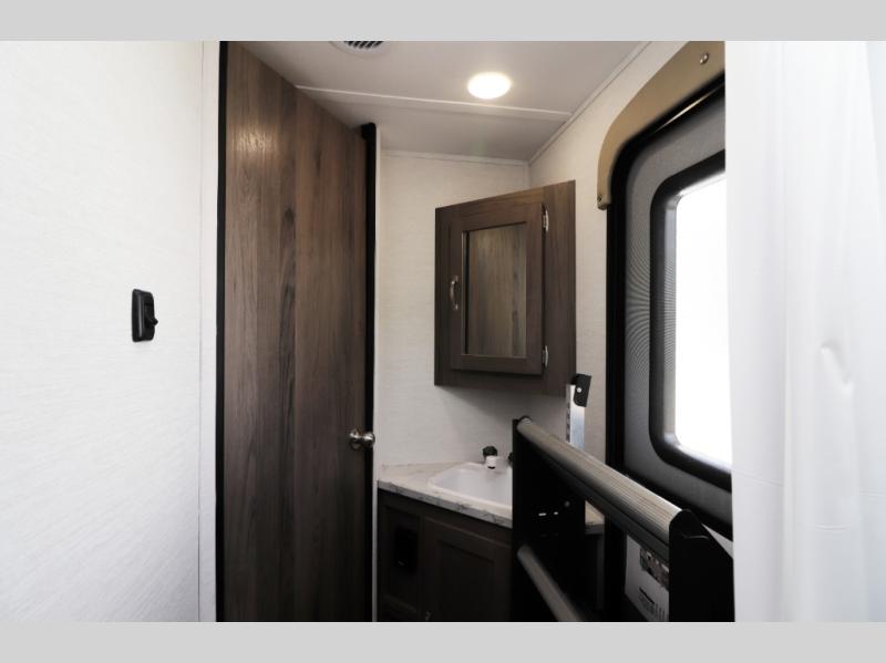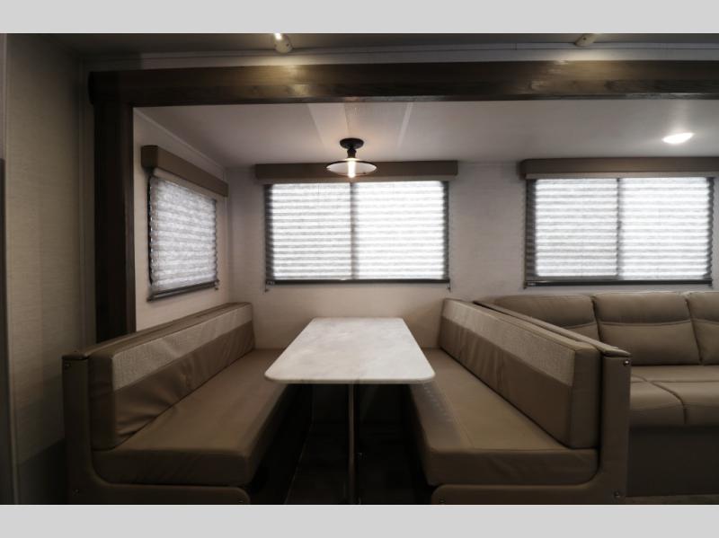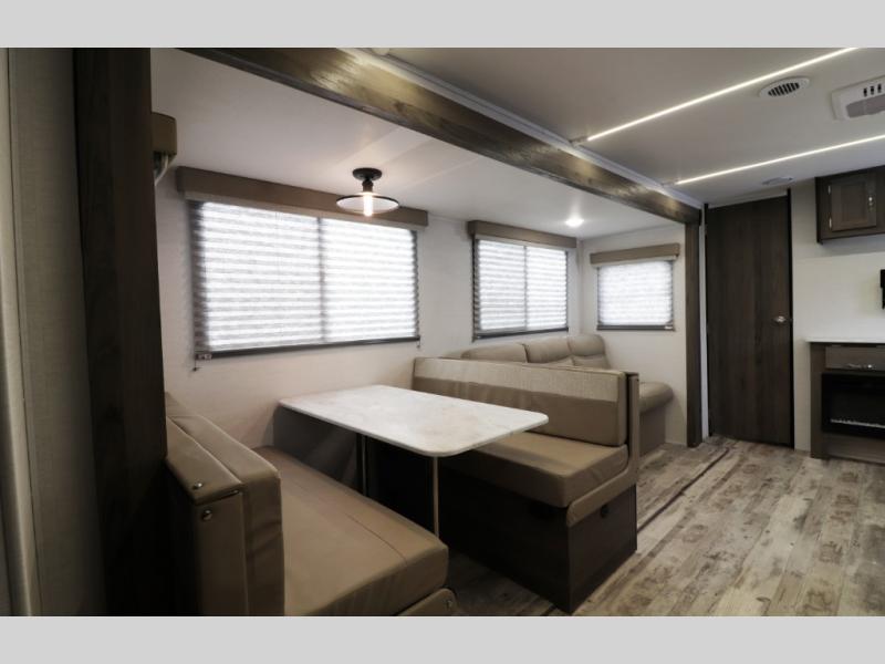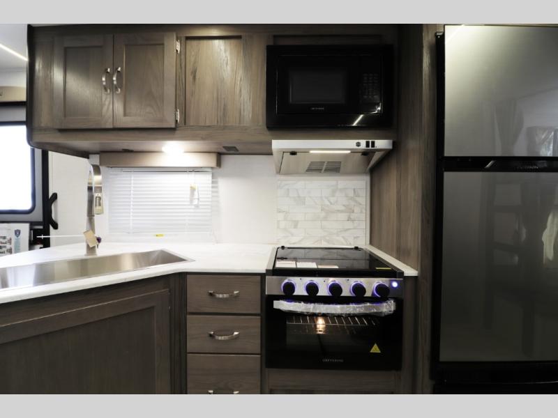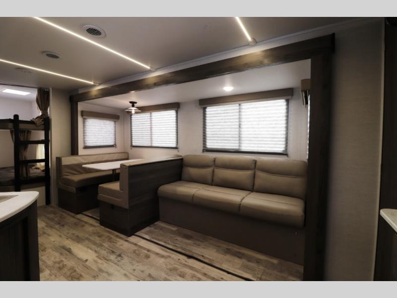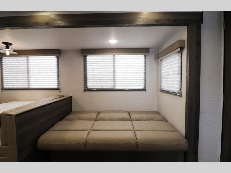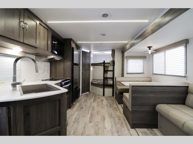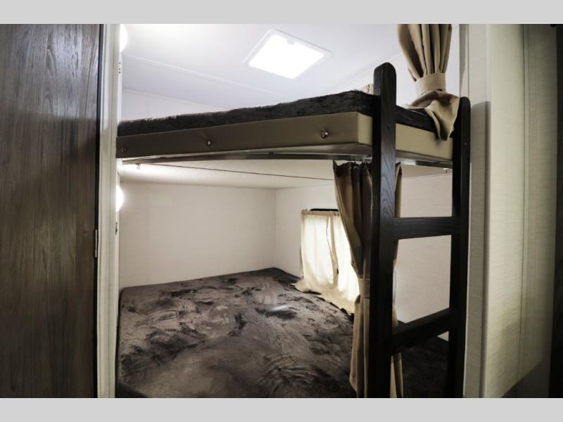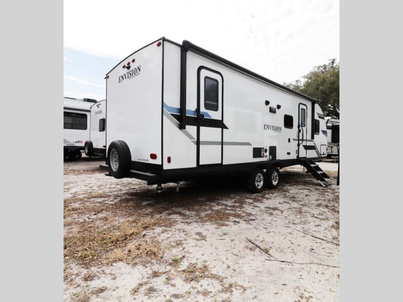 The 28BBS bunkhouse floorplan delivers the space and versatility families love, featuring comfortable sleeping areas, a private master bedroom, and dedicated bunk beds perfect for kids or guests. The spacious living area creates a relaxing environment for evenings indoors, while the fully equipped kitchen allows you to cook real meals on the road with ease. Expect residential-style comfort including a large refrigerator, cooktop, microwave, ample storage, and smart interior layout designed for long trips or weekend getaways. Many Envision models also include features like pass-through storage, electric awning with LED lighting, and durable lightweight construction for easier towing.