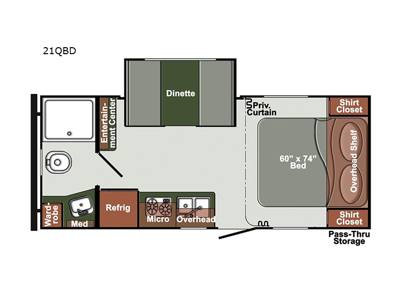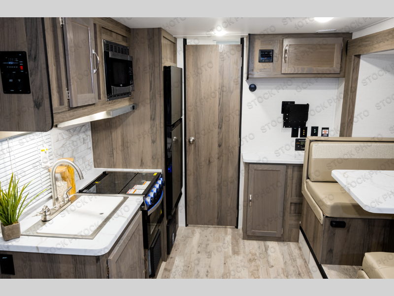 The slide out in this travel trailer will provide more interior space to relax, sleep, and play! You and your spouse will appreciate the privacy curtain around the bed if you happen to have any overnight guests sleep on the booth dinette. The chef of the family will have everything they need to prepare meals each day; a cooktop, microwave oven, plus an 8 cu. ft. 12V refrigerator for leftovers. There is plenty of storage space in this model, including overhead cabinets, a bathroom wardrobe, plus dual shirt closets on either side of the bed. And don't forget about the pass-through storage for your fishing poles!