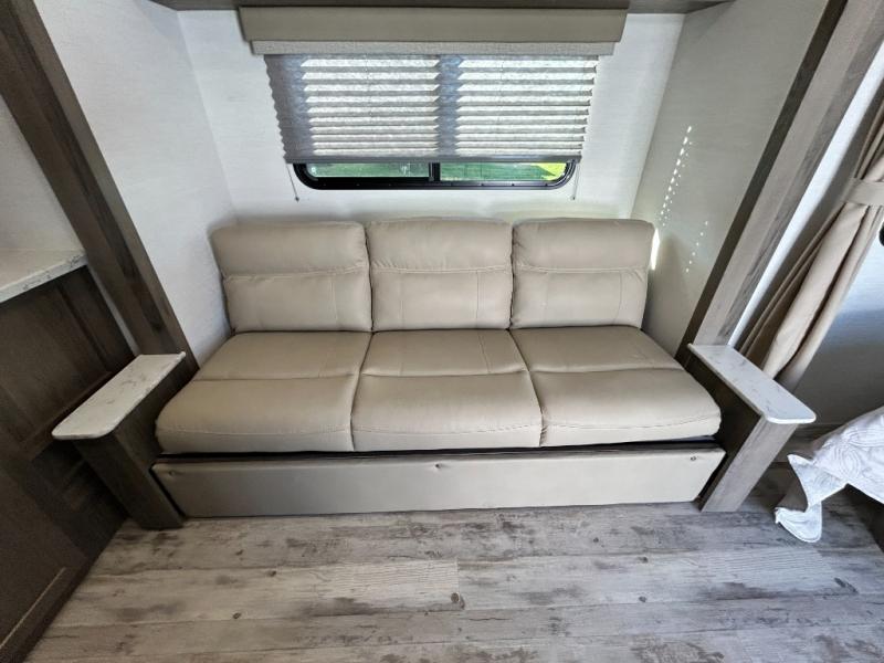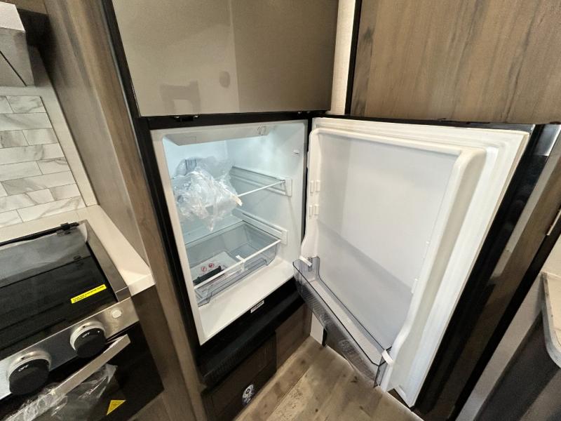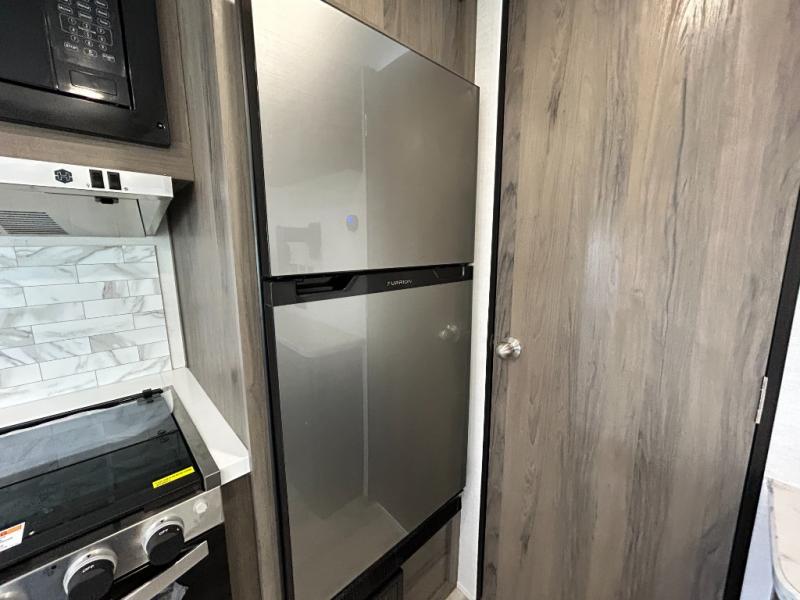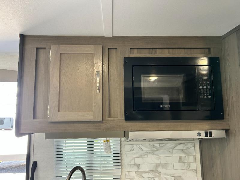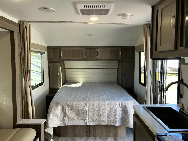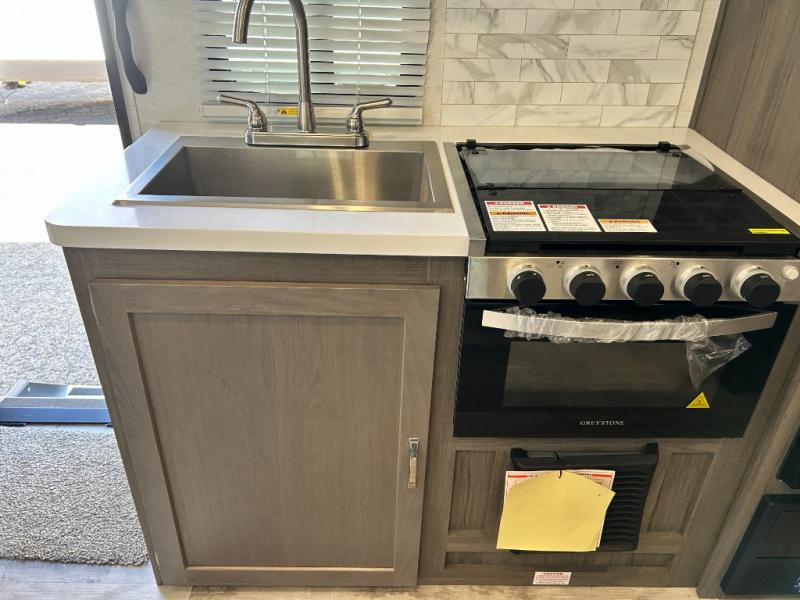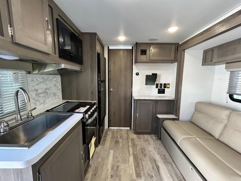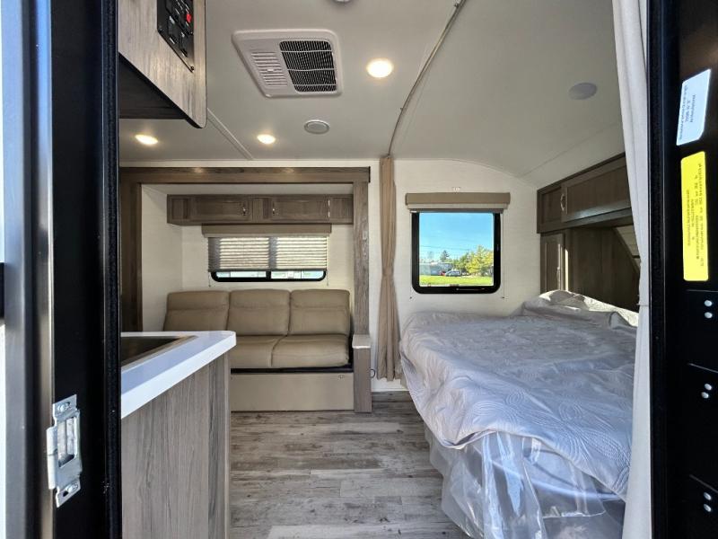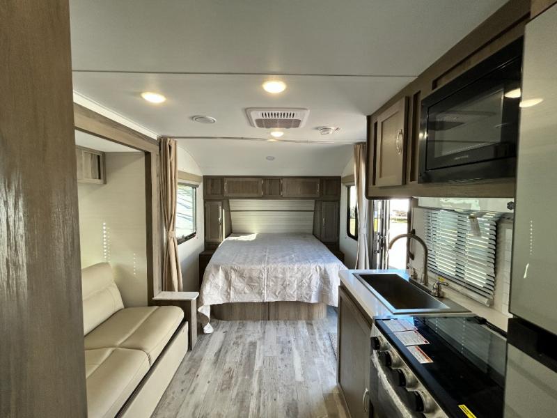 Are you looking for a lightweight travel trailer to take to the lake or woods? This model includes an RV queen bed up front with dual shirt closets and a privacy curtain for you own space. The kids can sleep on the slide out sofa, and the folding table here be perfect for meal times and game night. If you don't want to roast hot dogs every day, the cooktop is sure to come in handy, plus there is a microwave oven for popcorn. This model also in includes a full rear bath so you can clean up before bed just like you do at home!