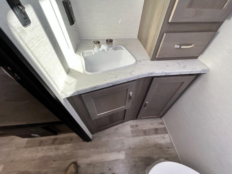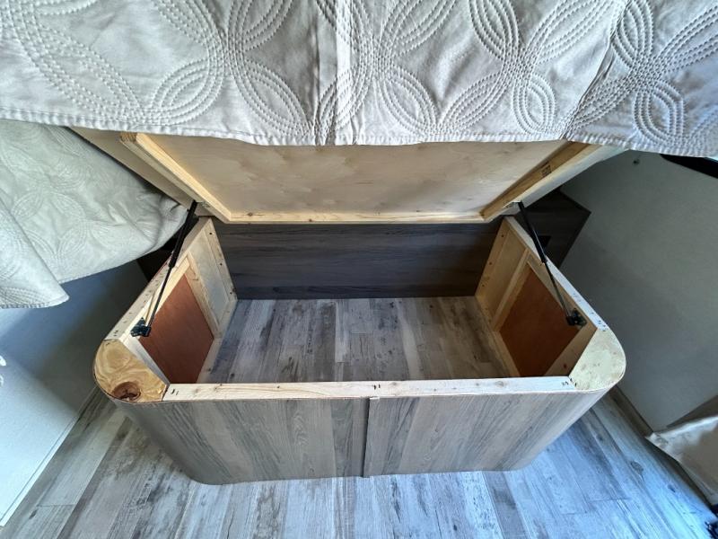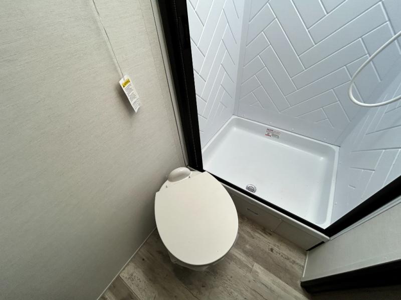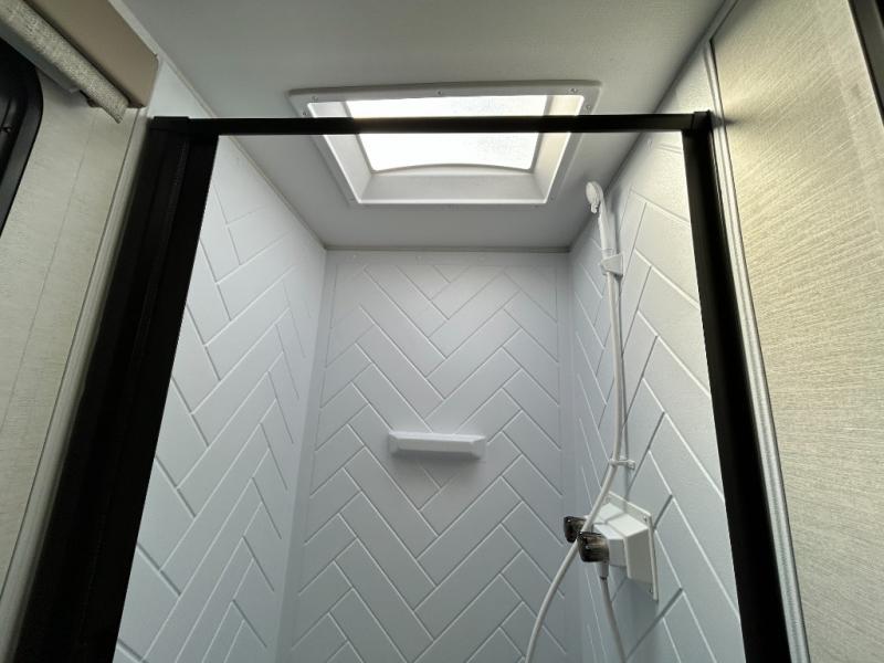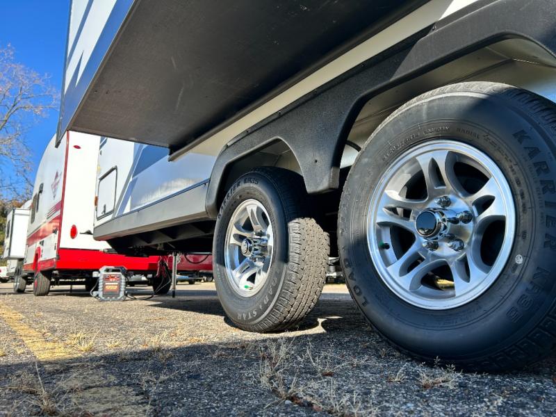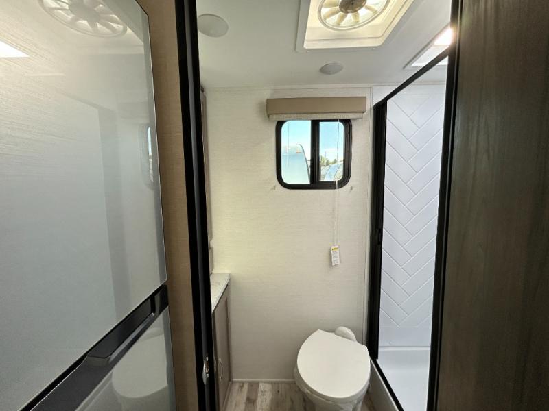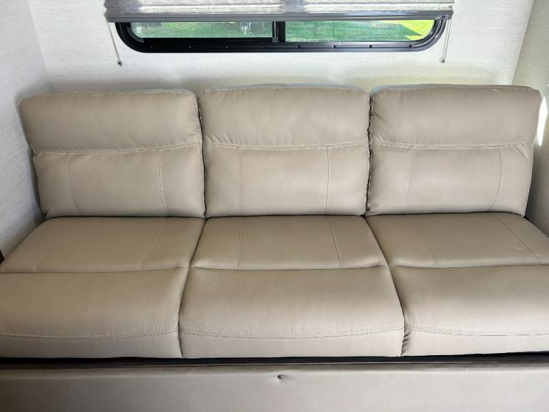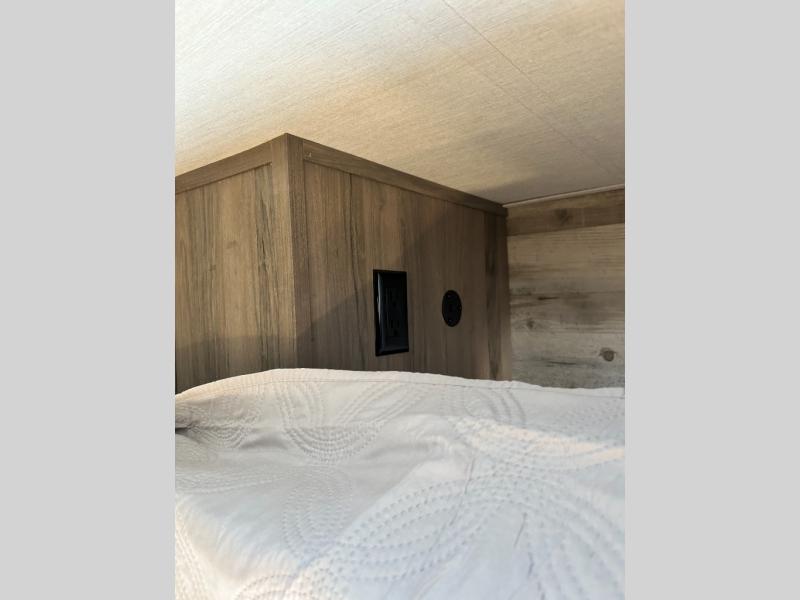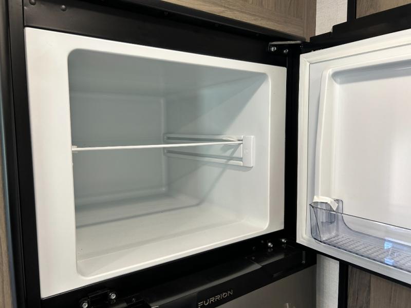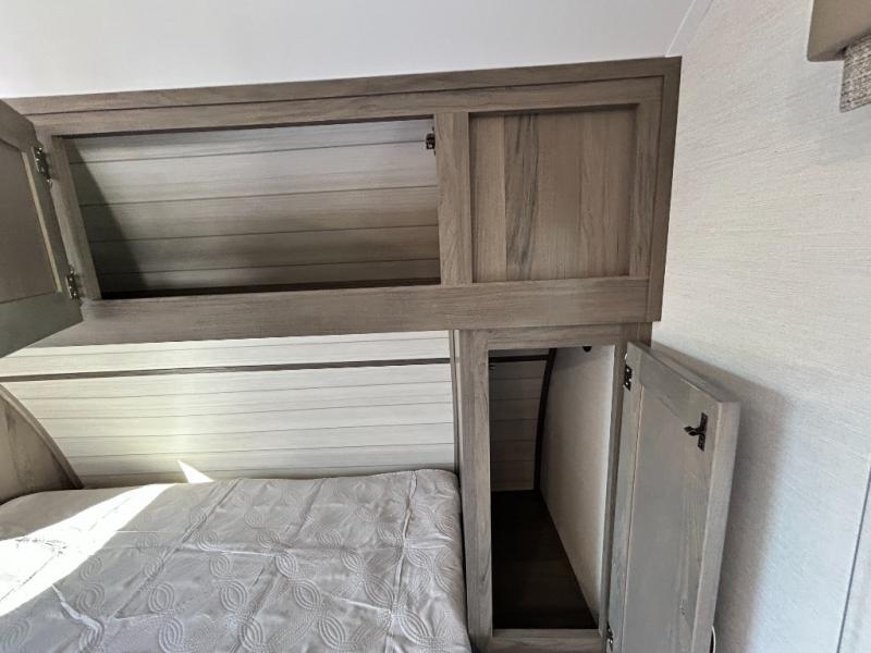 Are you looking for a lightweight travel trailer to take to the lake or woods? This model includes an RV queen bed up front with dual shirt closets and a privacy curtain for you own space. The kids can sleep on the slide out sofa, and the folding table here be perfect for meal times and game night. If you don't want to roast hot dogs every day, the cooktop is sure to come in handy, plus there is a microwave oven for popcorn. This model also in includes a full rear bath so you can clean up before bed just like you do at home!