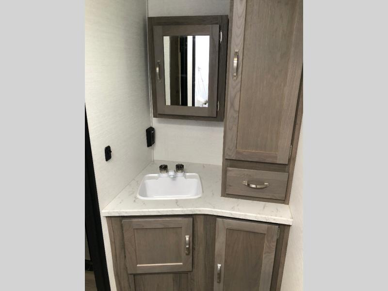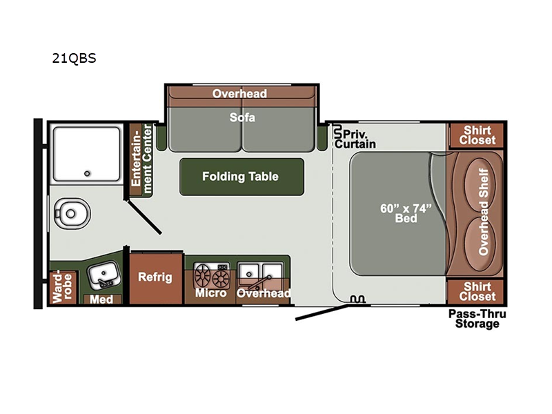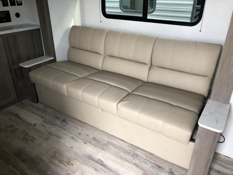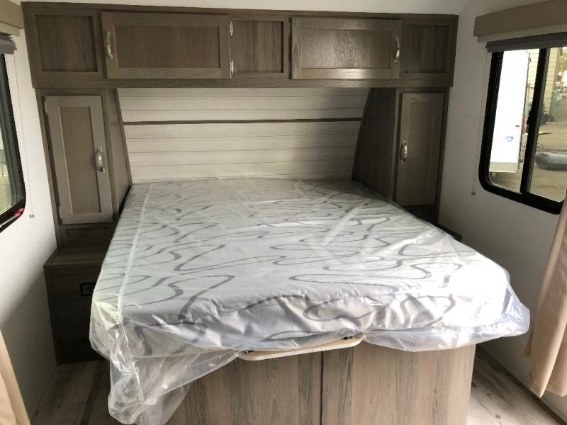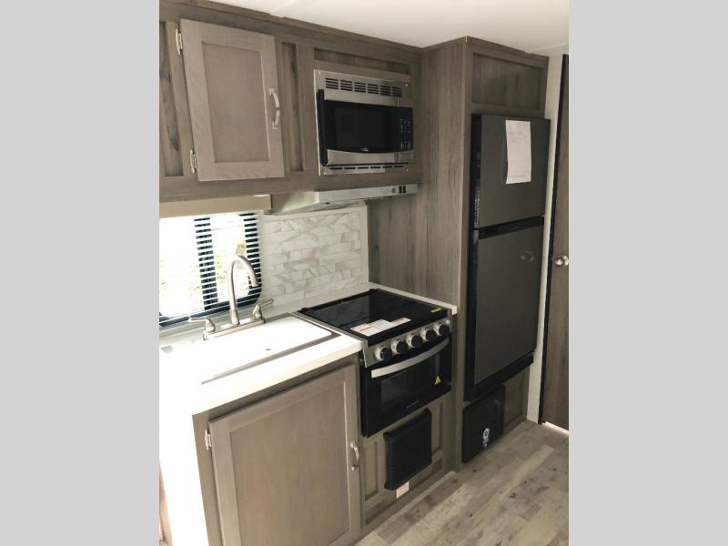 Are you looking for a lightweight travel trailer to take to the lake or woods? This model includes an RV queen bed up front with dual shirt closets and a privacy curtain for you own space. The kids can sleep on the slide out sofa, and the folding table here be perfect for meal times and game night. If you don't want to roast hot dogs every day, the cooktop is sure to come in handy, plus there is a microwave oven for popcorn. This model also in includes a full rear bath so you can clean up before bed just like you do at home!