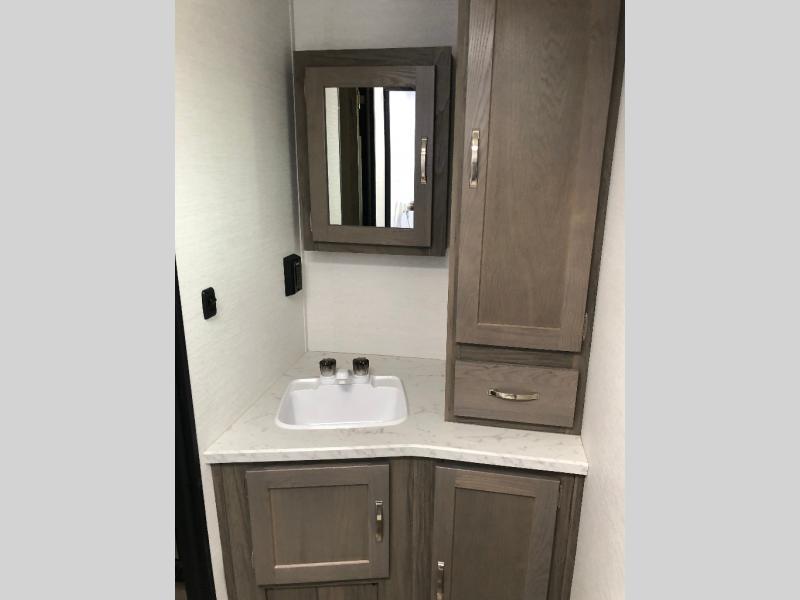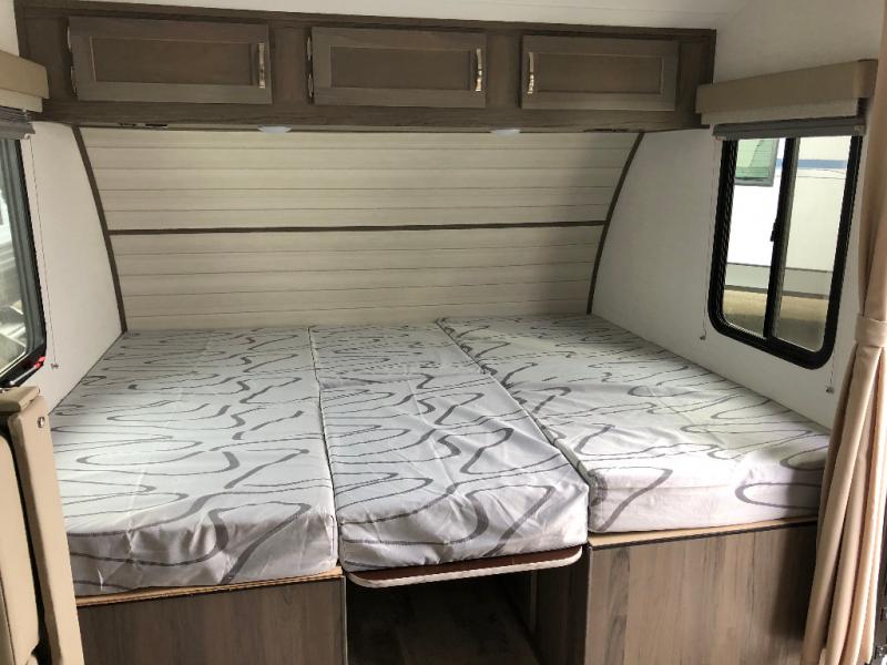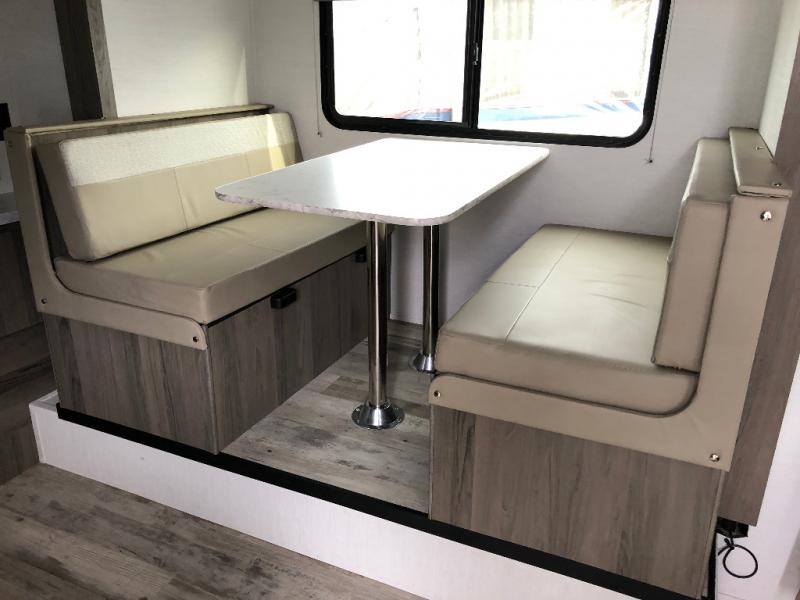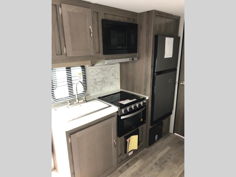 Whether you're camping with your spouse or friends, this travel trailer will be perfect for all your needs. There are two twin beds up front that include an insert to convert them into a king-size bed if you choose. Since there is a privacy curtain in front of the bed(s), you can have an overnight guest stay on the slide out booth dinette and still enjoy your own space. Everyone can stay fresh and clean in the full rear bath, and there is a closet/storage space for necessities or towels. This model includes a cooktop and a microwave oven to cook up your best meals, and if the weather is nice you can dine outside under the electric awning with LED lights.