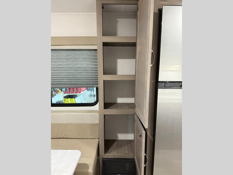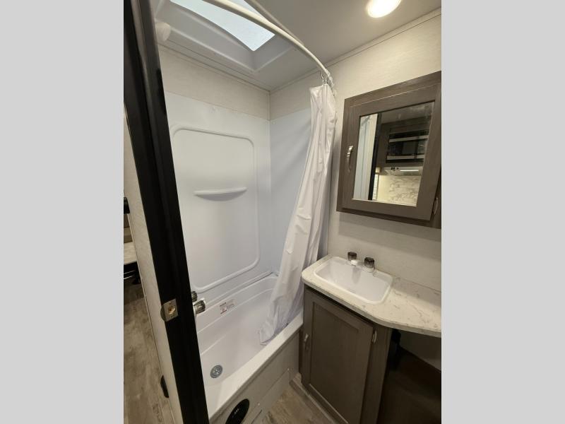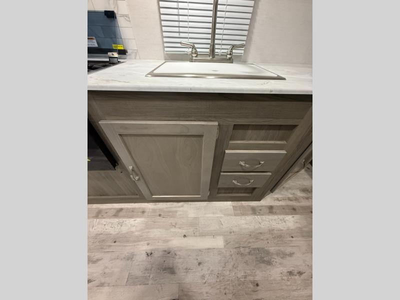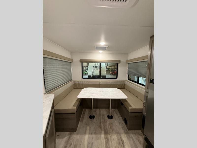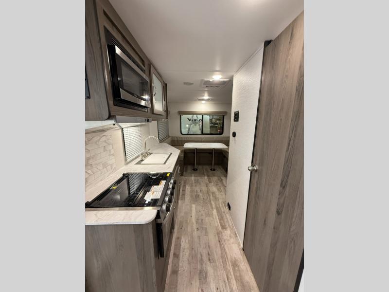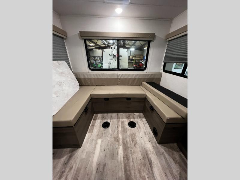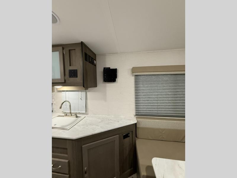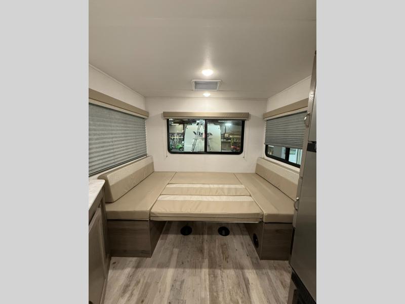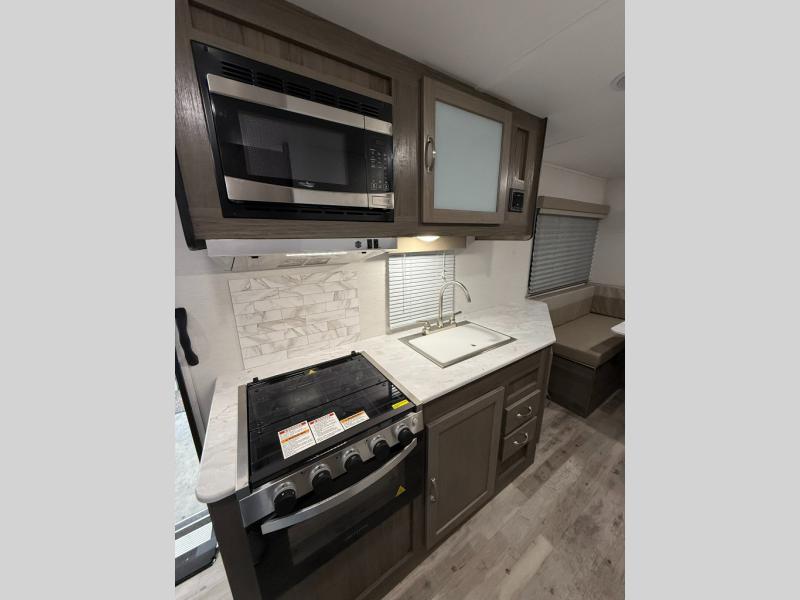Escape the hustle and bustle of big city life and enjoy your weekends away in this comfortable travel trailer. You will feel right at home with an RV queen bed up front with dual shirt closet for your clothes. The full bath allows you to clean up each day, and the U-shaped dinette will be perfect for dining or additional sleeping space. In the kitchen you'll find a cooktop, a microwave oven, plus an 8 cu. ft.12V refrigerator for perishables. There is even a pantry for all the snacks or canned goods. After dinner, head outside to sit under the electric awning with LED lights before calling it a night!