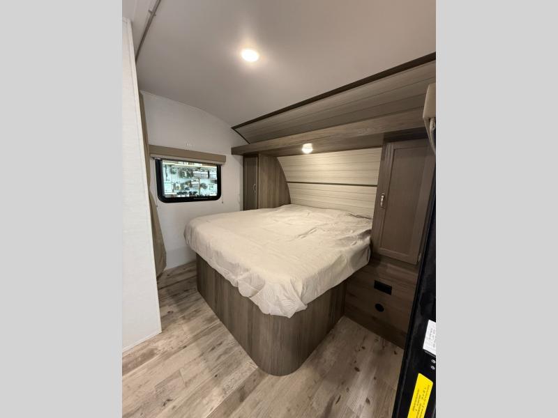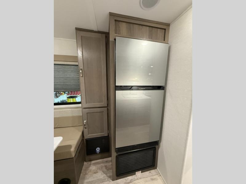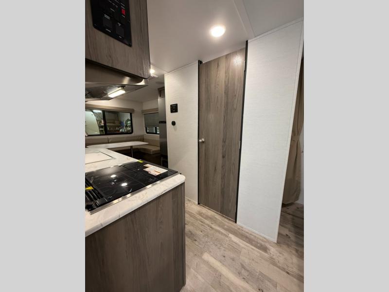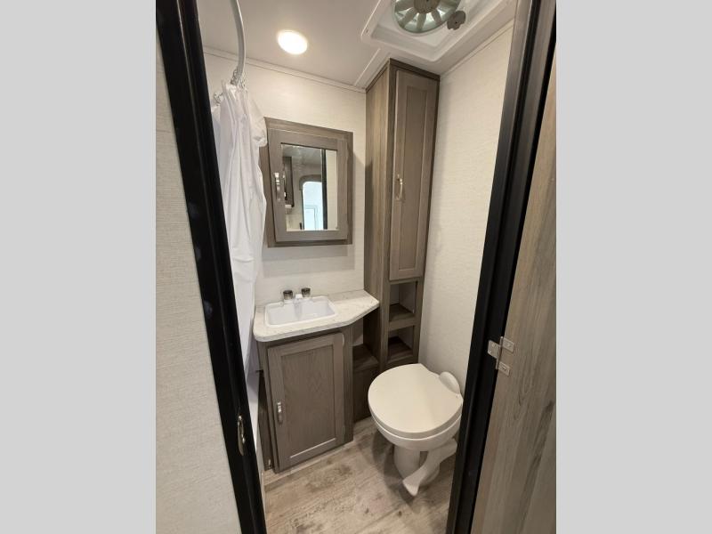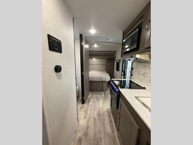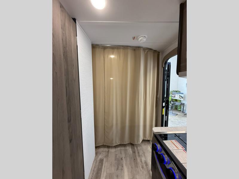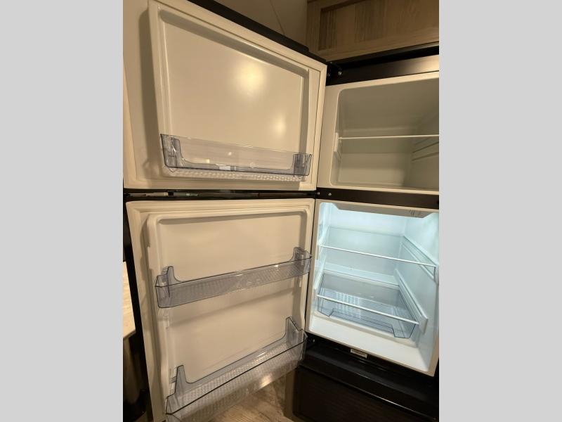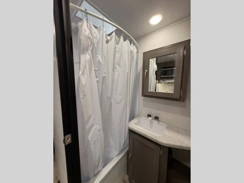 Escape the hustle and bustle of big city life and enjoy your weekends away in this comfortable travel trailer. You will feel right at home with an RV queen bed up front with dual shirt closet for your clothes. The full bath allows you to clean up each day, and the U-shaped dinette will be perfect for dining or additional sleeping space. In the kitchen you'll find a cooktop, a microwave oven, plus an 8 cu. ft.12V refrigerator for perishables. There is even a pantry for all the snacks or canned goods. After dinner, head outside to sit under the electric awning with LED lights before calling it a night!