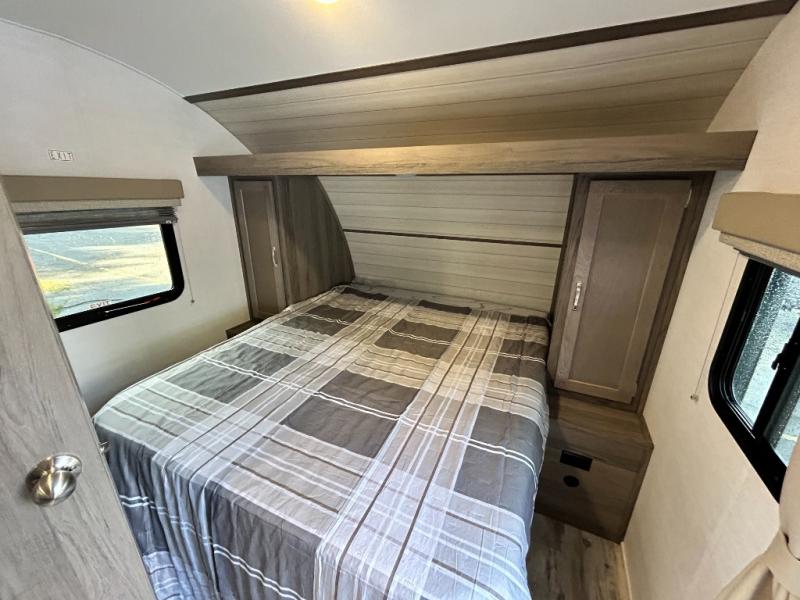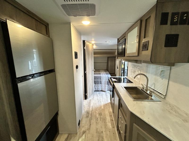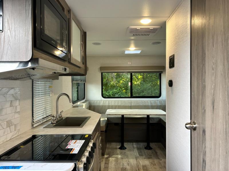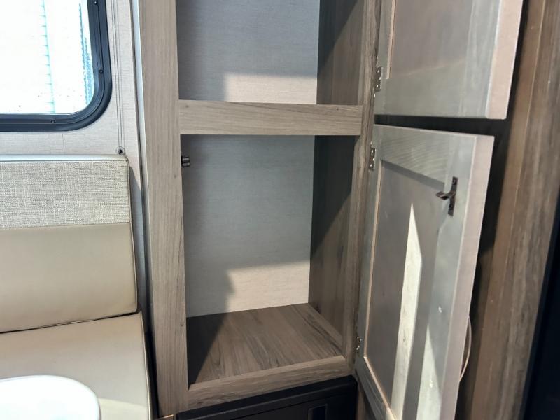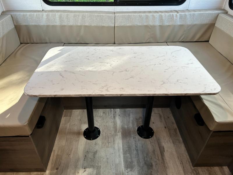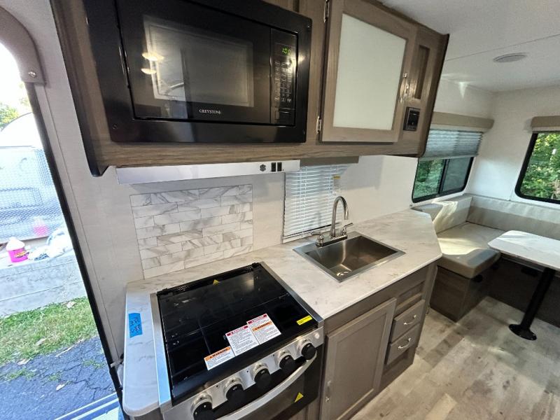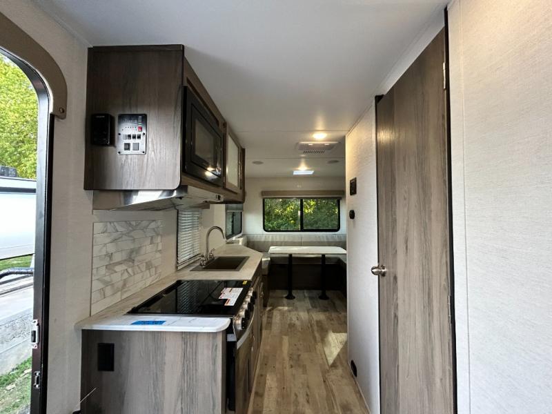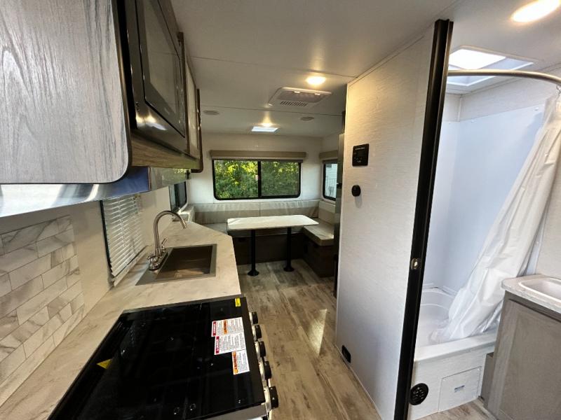 Escape the hustle and bustle of big city life and enjoy your weekends away in this comfortable travel trailer. You will feel right at home with an RV queen bed up front with dual shirt closet for your clothes. The full bath allows you to clean up each day, and the U-shaped dinette will be perfect for dining or additional sleeping space. In the kitchen you'll find a cooktop, a microwave oven, plus an 8 cu. ft.12V refrigerator for perishables. There is even a pantry for all the snacks or canned goods. After dinner, head outside to sit under the electric awning with LED lights before calling it a night!