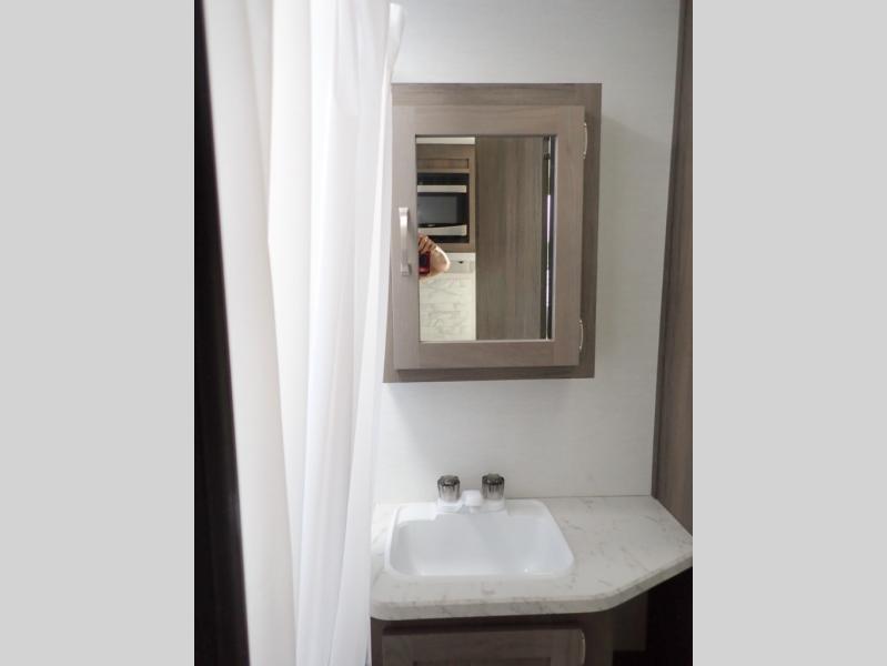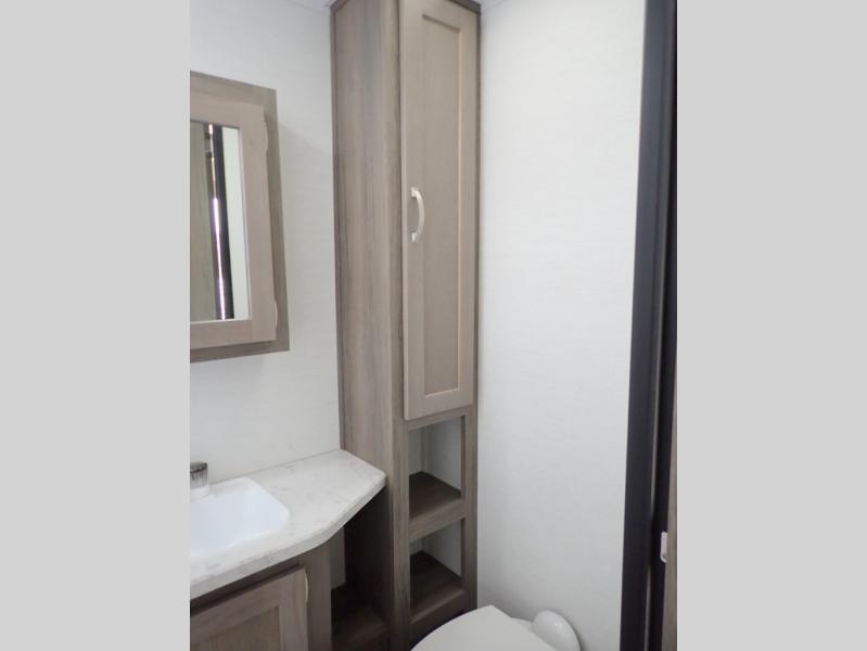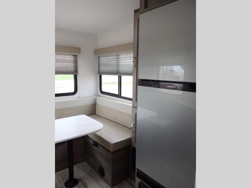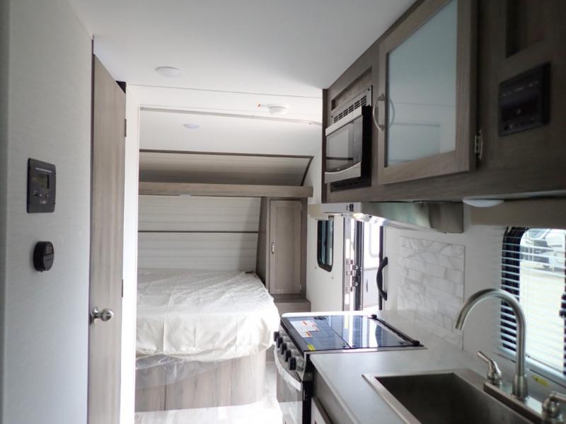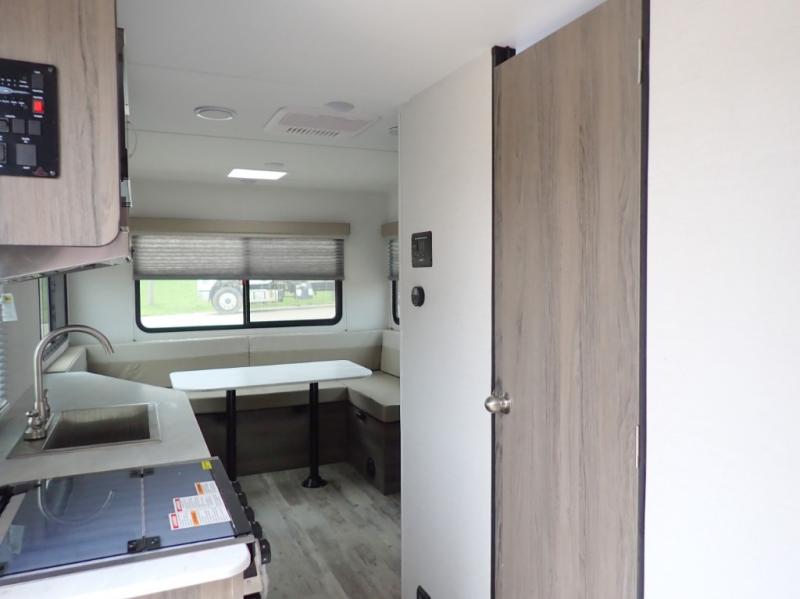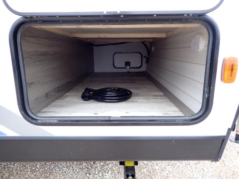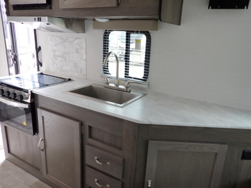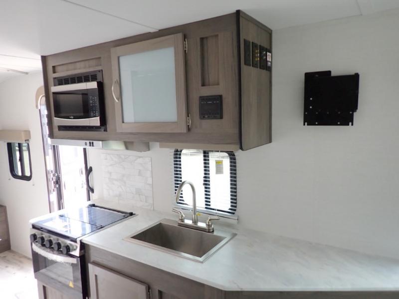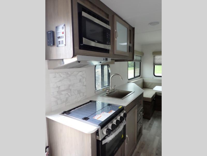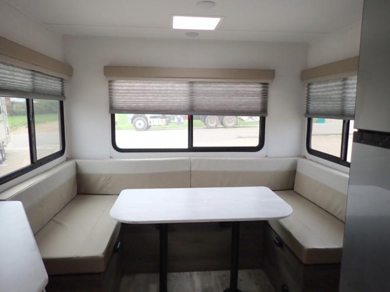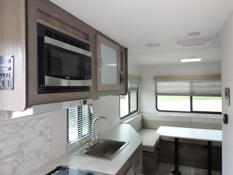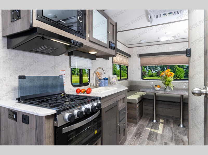 Escape the hustle and bustle of big city life and enjoy your weekends away in this comfortable travel trailer. You will feel right at home with an RV queen bed up front with dual shirt closet for your clothes. The full bath allows you to clean up each day, and the U-shaped dinette will be perfect for dining or additional sleeping space. In the kitchen you'll find a cooktop, a microwave oven, plus an 8 cu. ft.12V refrigerator for perishables. There is even a pantry for all the snacks or canned goods. After dinner, head outside to sit under the electric awning with LED lights before calling it a night!