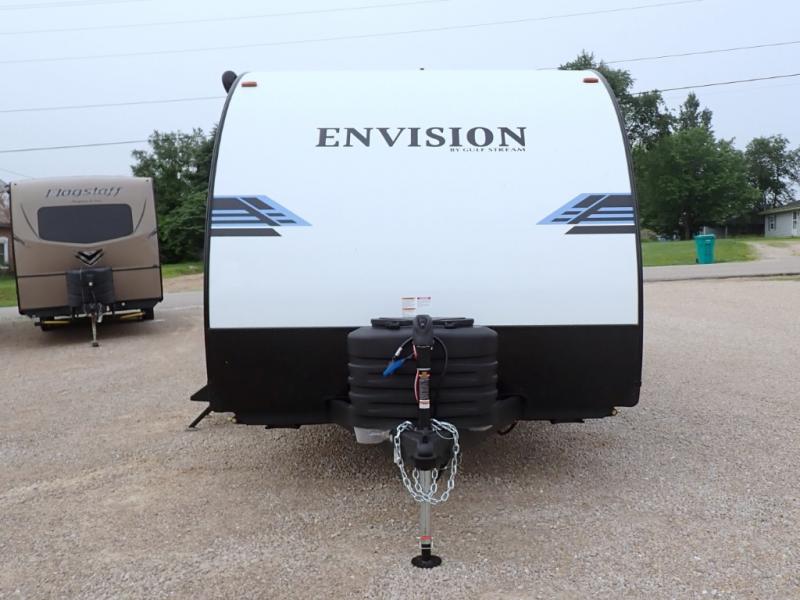 The Envision SVT travel trailers by Gulf Stream have got you covered when it comes to convenience, affordability, and comfort! Each model includes four manual stabilizer jacks, a friction hinge entry door, and deluxe slam-latch luggage doors so you can pack everything up quickly and easily. The fiberglass exterior sidewalls and one-piece vinyl roof create a lightweight trailer for easy towing, and each model comes standard with many safety features for your peace of mind. The included and required SVT Package features night shades, a power tongue jack, a tankless water heater, and an electric awning with LED lights and speakers to name a few stand-out features!