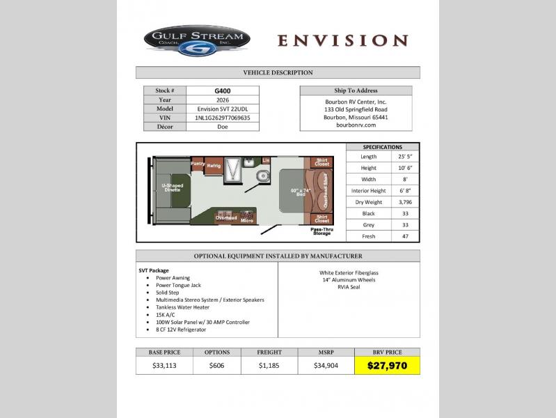 The Gulf Stream Envision SVT 22UDL is a excellent choice for a budget-friendly couple's camper. Ultra lightweight - easily towable by most vehicles. Sleeps up to 3. Front queen bed. The rear is a large U-shaped dinette that can also be converted into a sleeping area. You will love how the dinette is surrounded by large windows. Backed by Gulf Stream's three-year warranty.