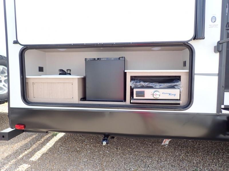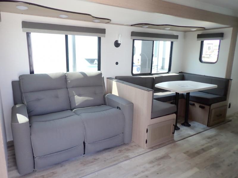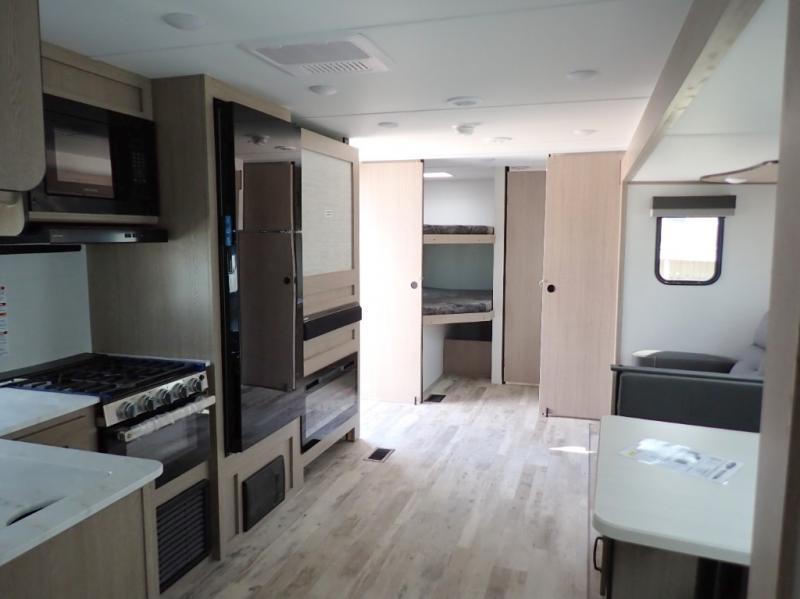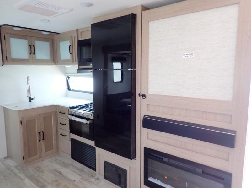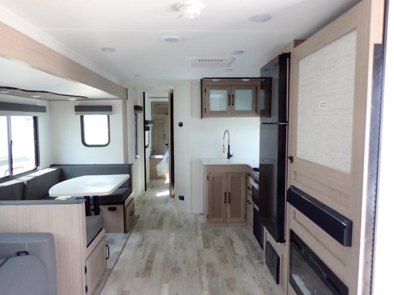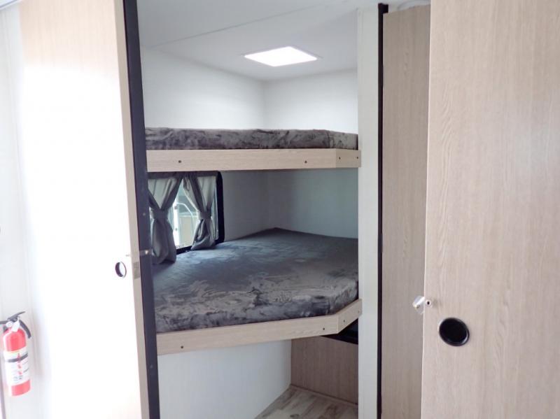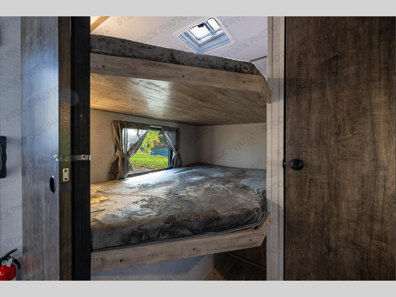 The whole family will have a good time in this travel trailer! The kiddos will have their own space in the rear private bunkhouse which has a set of double-size bunk beds next to a half bathroom and even a desk for them to get some work done. The front private bedroom has a queen bed for a good night's rest and a closet with shelf. Just outside the bedroom is the full bathroom to freshen up in each morning, and you can keep your bellies full with delicious home cooked meals prepared in the fully equipped kitchen. Enjoy your meals at the U-shaped dinette and relax on the sofa next to it, plus if you add the optional fireplace to the entertainment center then you can feel even more at home.
