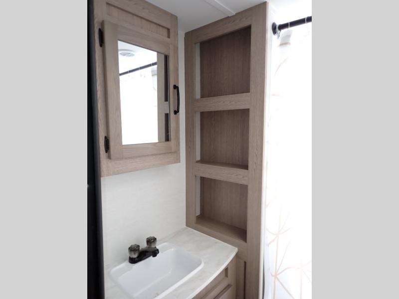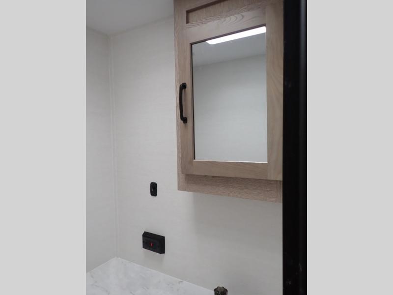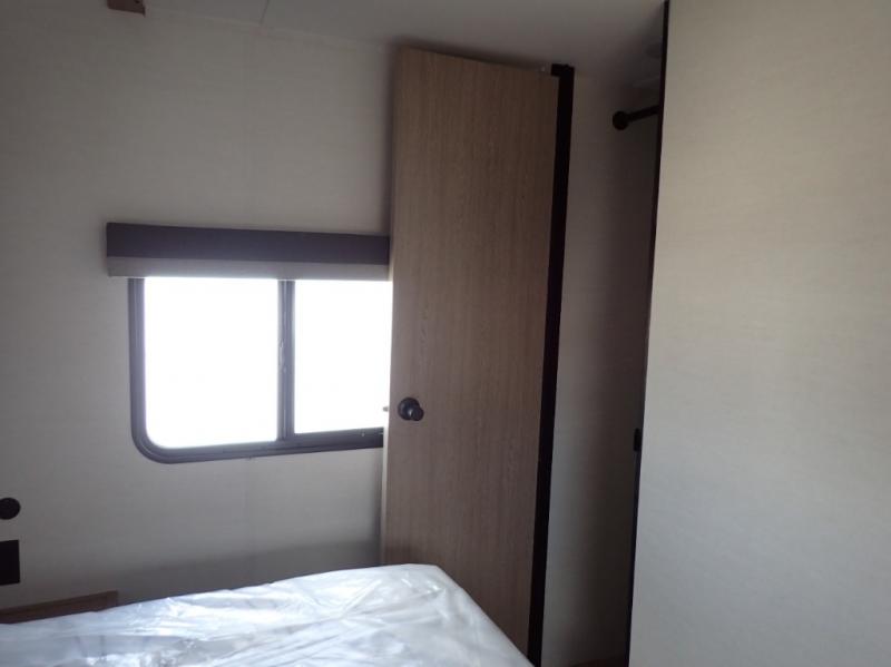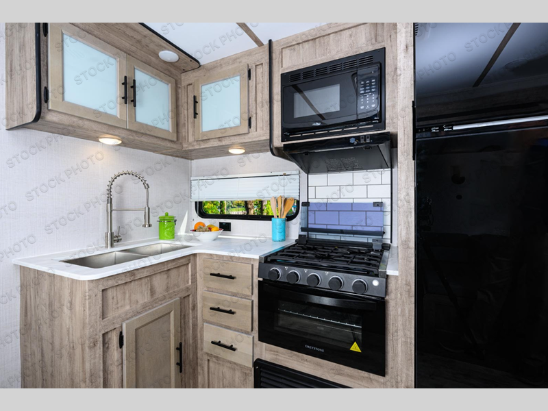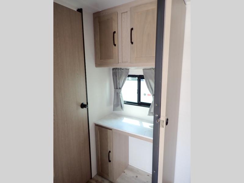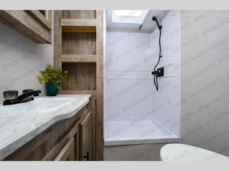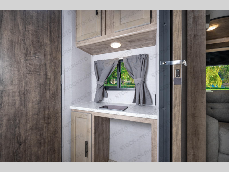 The whole family will have a good time in this travel trailer! The kiddos will have their own space in the rear private bunkhouse which has a set of double-size bunk beds next to a half bathroom and even a desk for them to get some work done. The front private bedroom has a queen bed for a good night's rest and a closet with shelf. Just outside the bedroom is the full bathroom to freshen up in each morning, and you can keep your bellies full with delicious home cooked meals prepared in the fully equipped kitchen. Enjoy your meals at the U-shaped dinette and relax on the sofa next to it, plus if you add the optional fireplace to the entertainment center then you can feel even more at home.