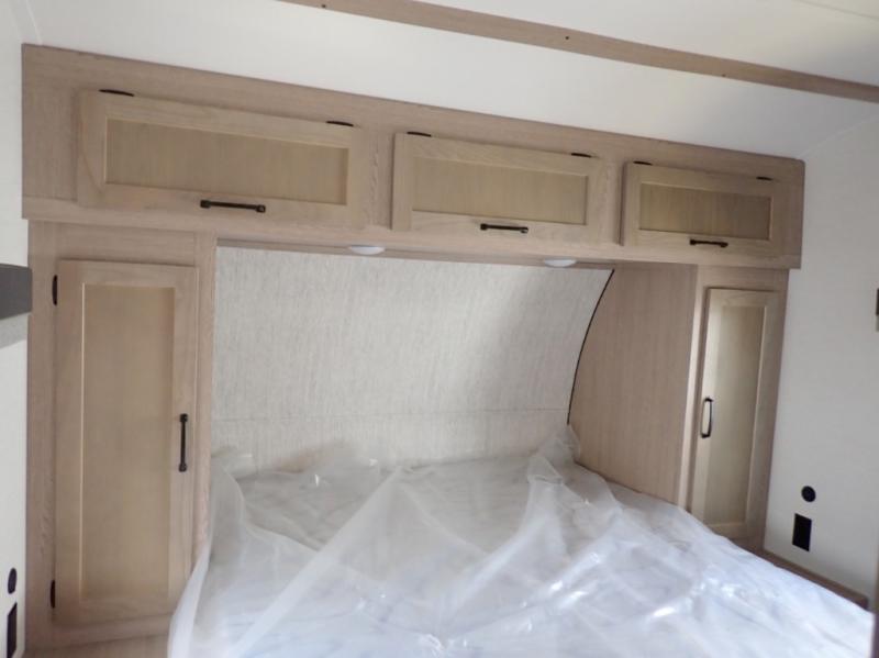 With any Kingsport Supreme Series travel trailer by Gulf Stream RV, some key features include the extensive storage space throughout, the extra-wide entry door with a privacy window and deadbolt lock, plus the large picture windows for natural lighting and beautiful views. And some of the key construction details include a one-piece seamless roof, a truss-style crowned roof system, plus sidewalls, celling and floor screwed, glued and tied together with steel straps for unmatched Uni-body strength and resilience. The included Supreme Package includes an electric hitch jack and four stabilizer jacks for easy set up, an electric awning with LED lights, upgraded graphics, plus a heated and enclosed underbelly for better protection all year long. The interior will have you feeling right at home with designer backsplash, pleated shades, upgraded valances, and a bath skylight to name a few comforts!