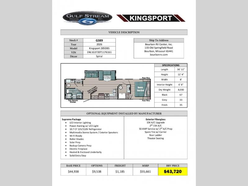 Gulf Stream Kingsport 285DBS Highlights: