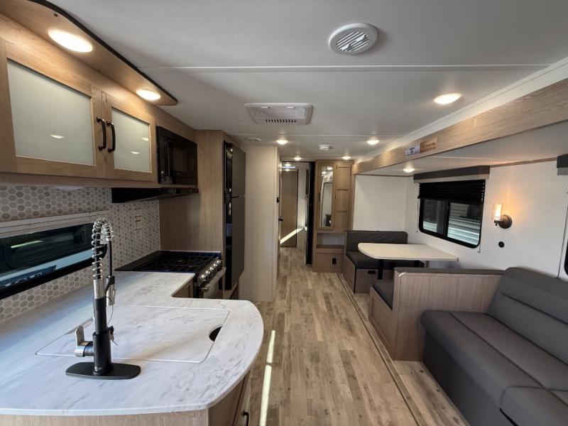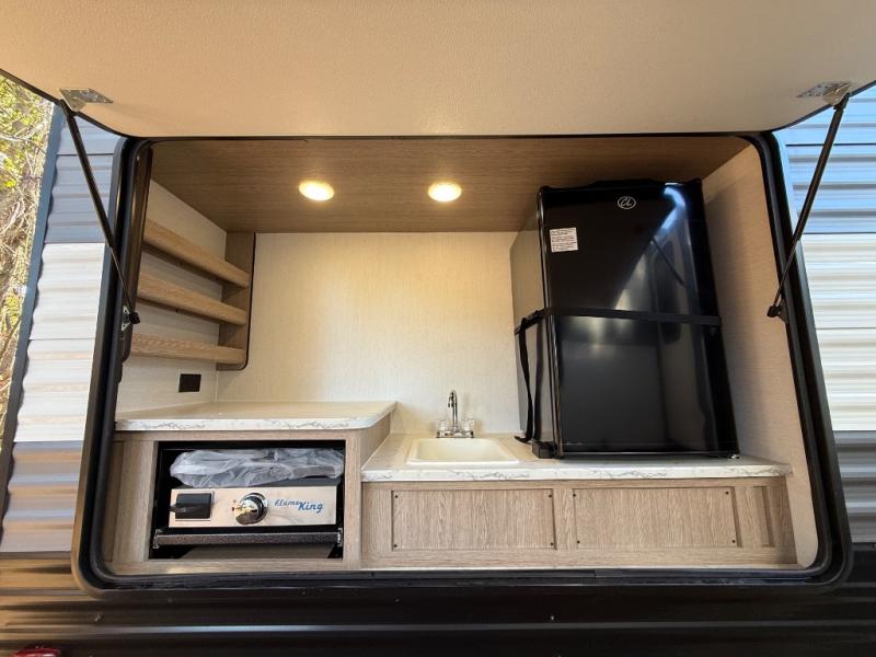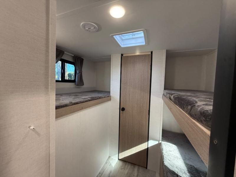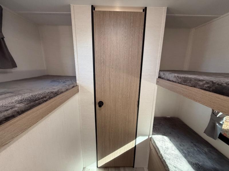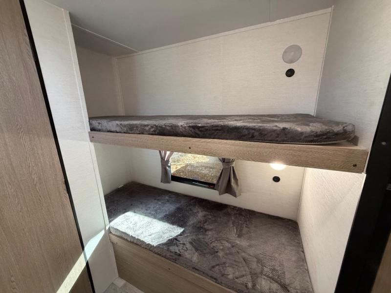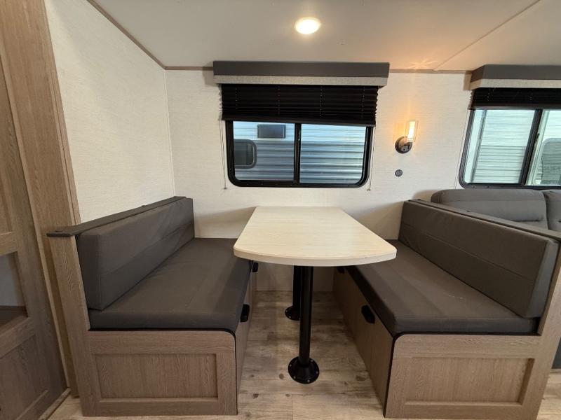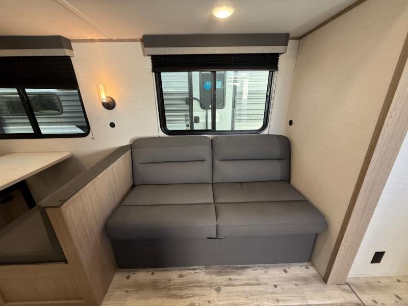 Calling all groups that need sleeping space for nine and outdoor fun! This trailer is perfect for a bigger group of friends or a larger family thanks to rear private bunkhouse with four bunks, a furniture slide out with a booth dinette and sofa, plus a private bedroom with a queen-size bed. Even on a rainy day, everyone will have their own space in one of the rooms. The chef will have full amenities to make meals, plus you might like to add the optional outside kitchen for more choices at meal time. The outside also offers a pass-through compartment for larger items and more gear, and the electric awning with LED lights provides an outdoor living area to enjoy.