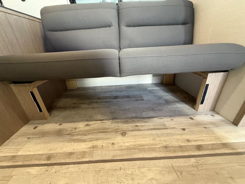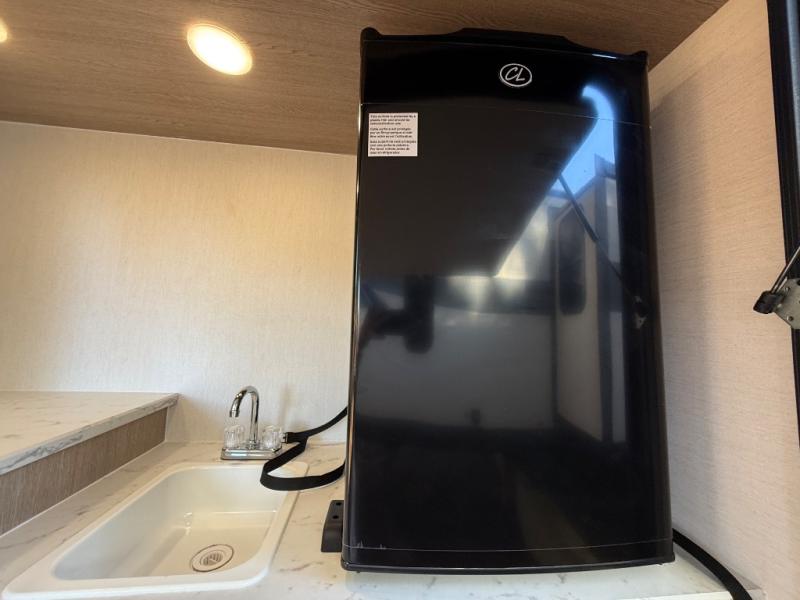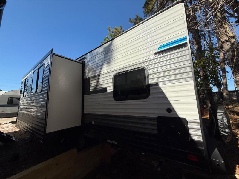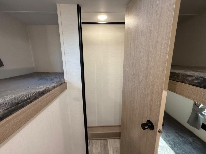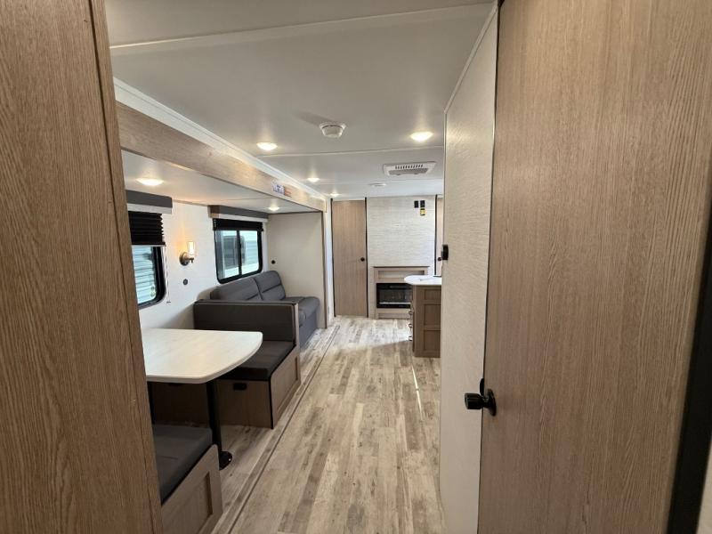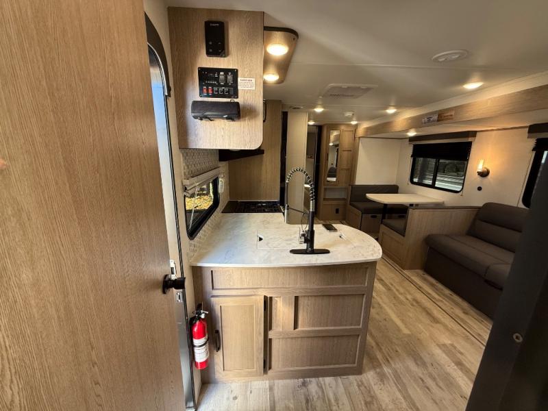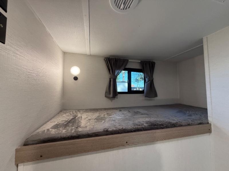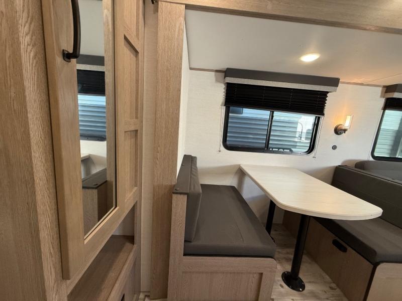 Calling all groups that need sleeping space for nine and outdoor fun! This trailer is perfect for a bigger group of friends or a larger family thanks to rear private bunkhouse with four bunks, a furniture slide out with a booth dinette and sofa, plus a private bedroom with a queen-size bed. Even on a rainy day, everyone will have their own space in one of the rooms. The chef will have full amenities to make meals, plus you might like to add the optional outside kitchen for more choices at meal time. The outside also offers a pass-through compartment for larger items and more gear, and the electric awning with LED lights provides an outdoor living area to enjoy.