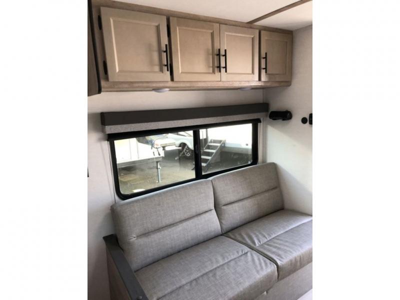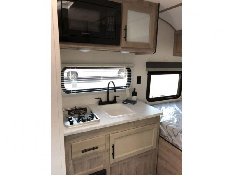 Head out on your greatest adventures in the woods with this teardrop trailer! Get a good night's rest each night on the front 54" x 80" bed with overhead cabinets and relax on the sofa during the day. Across from the sofa is a TV mount location and above it is overhead cabinets to keep your items out of the way. You can also use the exterior trunk for your hiking gear. After a fun day outside, head to the rear corner bathroom to freshen up in the neo-angled shower. The kitchen has everything you need to prepare delicious home cooked meals like a gas/electric refrigerator, a microwave oven, a hot/cold sink, and a two burner gas cooktop to fry up the catch of the day. You even have an outside shower to rinse the mud off your feet!